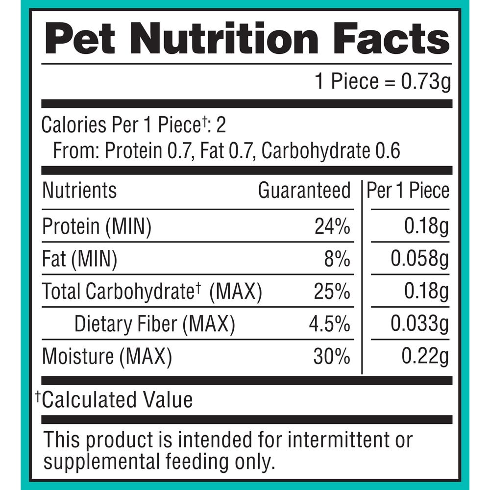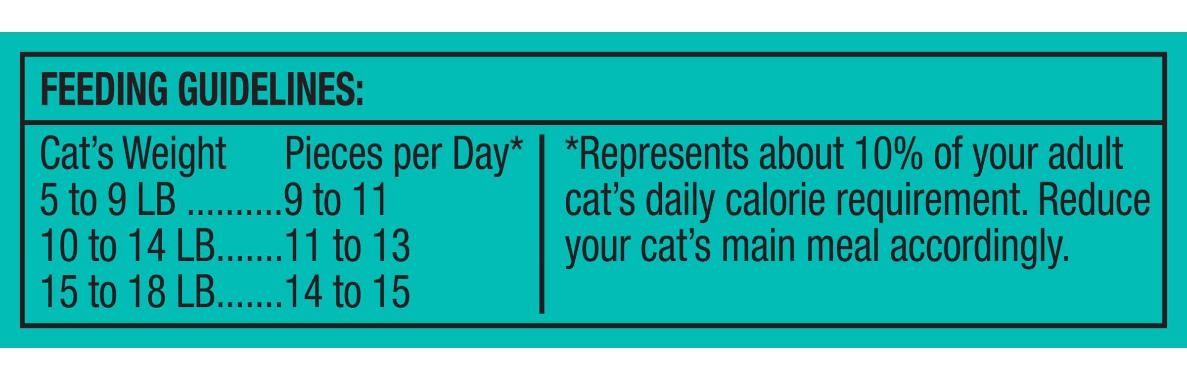 Feeding instructions: 5 to 9 lb (cat's weight): 9 to 11 [pieces per day (represents about 10% of your adult cat‚äôs daily calorie requirement. reduce your cat‚äôs main meal accordingly)]. 10 to 14 lb (cat‚äôs weight): 11 to 13 [pieces per day (represents about 10% of your adult cat‚äôs daily calorie requirement. reduce your cat‚äôs main meal accordingly)].