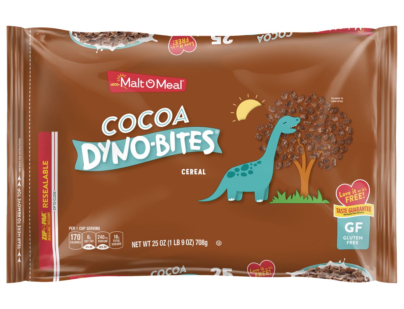 Per 1 Cup Serving: 170 calories; 0 g sat fat (0% DV); 240 mg sodium (10% DV); 18 g total sugars. Gluten free. Made with real cocoa, Cocoa Dyno-Bites cereal is a chocolate lover's dream. These sweet little crispy rice puffs are gluten free! the perfect combination of flavor and goodness Congratulations You've got breakfast in the bag. Malt-O-Meal has been creating delicious, high-quality cereals for nearly a century. That's a pretty big deal and so is the bag you're holding. Bigger bags mean fewer trips to the store, and that saves you time and money. There aren't many sure things in life, but you can always count on Malt-O-Meal for - incredible taste at an everyday low price. This package is sold by weight. Not by volume. Cereal may settle during shipment. Love it or it's free Put your taste buds to the test We're sure you will love this product. But if you're not completely satisfied, we'll refund or replace your purchase. • Post consumer brands, llc, Lakeville MN 55044 • Packaging: Reusable
