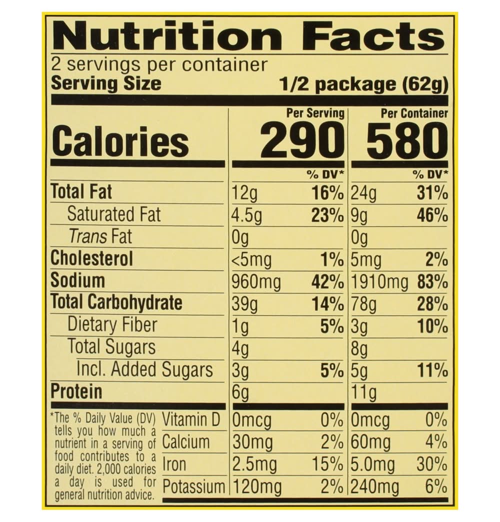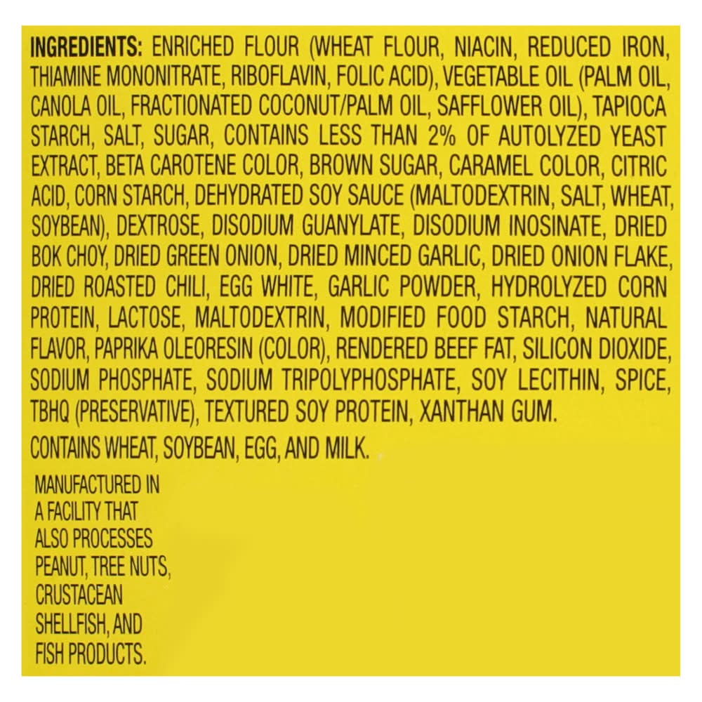 Ingredients: Enriched Flour (Wheat Flour, Niacin, Reduced Iron, Thiamine Mononitrate, Riboflavin, Folic Acid), Vegetable Oil (Palm Oil, Canola Oil, Fractionated Coconut/Palm Oil, Safflower Oil), Tapioca Starch, Salt, Sugar, Contains Less than 2% of Autolyzed Yeast Extract, Beta Carotene Color, Brown Sugar, Caramel Color, Citric Acid, Corn Starch, Dehydrated Soy Sauce (Maltodextrin, Salt, Wheat, Soybean), Dextrose, Disodium Guanylate, Disodium Inosinate, Dried Bok Choy, Dried Green Onion, Dried Minced Garlic, Dried Onion Flake, Dried Roasted Chili, Egg White, Garlic Powder, Hydrolyzed Corn Protein, Lactose, Maltodextrin, Modified Food Starch, Natural Flavor, Paprika Oleoresin (Color), Rendered Beef Fat, Silicon Dioxide, Sodium Phosphate, Sodium Tripolyphosphate, Soy Lecithin, Spice, TBHQ (Preservative), Textured Soy Protein, Xanthan Gum Contains: Wheat, Soybeans, Eggs, Milk, Tree Nuts, Coconuts, Corn, Lactose, Peanuts, Tree Nuts, Crustacean Shellfish, Fish