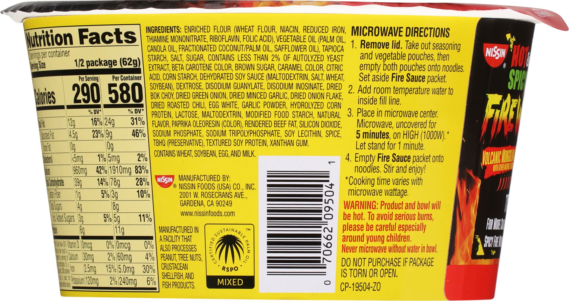 Directions: microwave directions: 1. remove lid. take out seasoning and vegetable pouches, then empty both pouches onto noodles. set aside fire sauce packet. 2. add room temperature water to inside fill line. 3. place in microwave center. microwave, uncovered for 5 minutes, on high (1000w) (cooking times varies with microwave wattage). let stand for 1 minute. warning: product and bowl will be hot. to avoid serious burns, please be careful especially around young children. never microwave without water in bowl. remove.