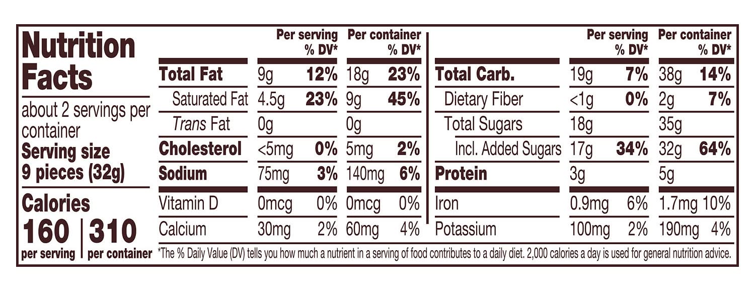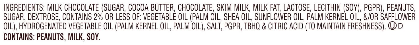Ingredients: SUGAR, VEGETABLE OIL (PALM OIL, SHEA OIL, SUNFLOWER OIL, PALM KERNEL OIL, /OR SAFFLOWER OIL), PEANUTS, LACTOSE (MILK), DEXTROSE, REDUCED PROTEIN WHEY (MILK), CHOCOLATE, SKIM MILK, CONTAINS 2% OR LESS OF: COCOA, COCOA PROCESSED WITH ALKALI, HYDROGENATED VEGETABLE OIL (PALM KERNEL OIL, PALM OIL), SALT, LECITHIN (SOY), PGPR, VANILLIN (ARTIFICIAL FLAVOR), TBHQ CITRIC ACID (TO MAINTAIN FRESHNESS), . Contains: Contains: Peanuts|Soy|Milk