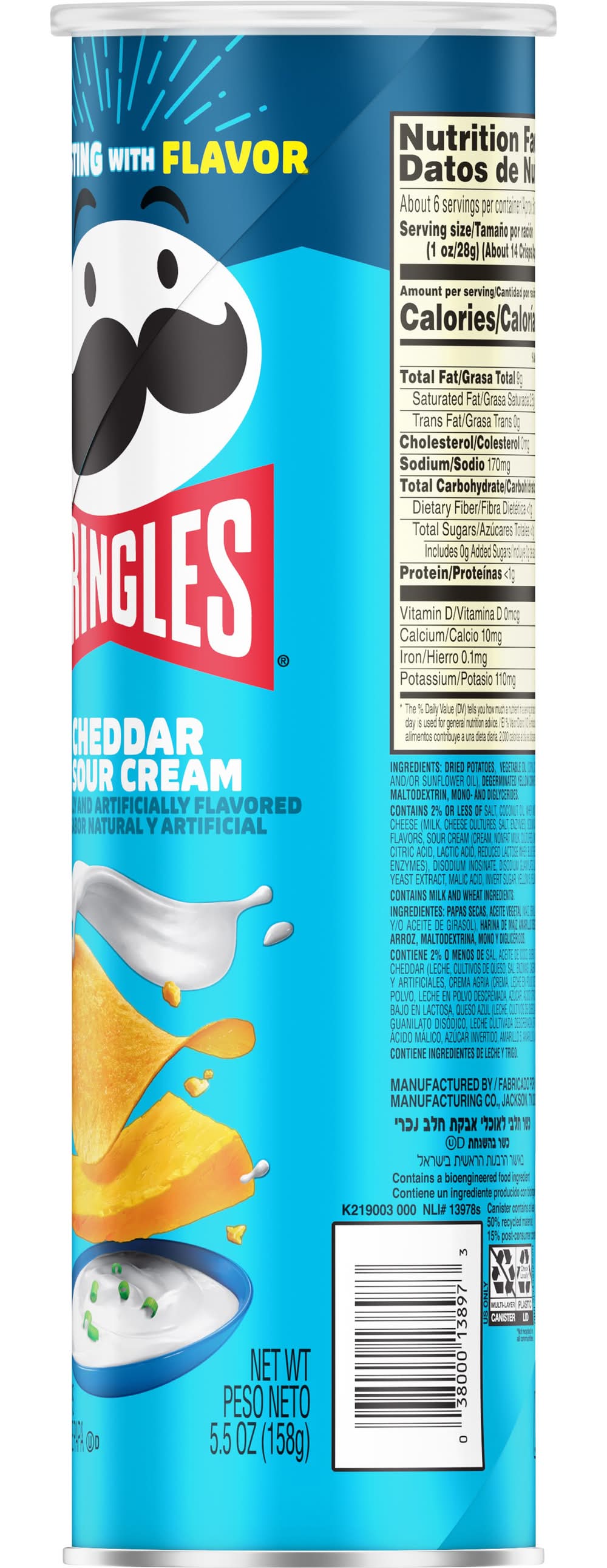 What comes next after the “pop” of a Pringles Cheddar and Sour Cream can? The crisp, hit-the-spot taste of potato seasoned with rich cheddar and sour cream. Includes one, 5.5-ounce can of ingeniously shaped Pringles Cheddar and Sour Cream Potato Crisps. Insanely light, crispy and never greasy, each crisp is bursting with cheesy flavor. With the convenient can, it’s easy to create your own snacking moments wherever and whenever. Bring a can to game time plus a few for other Pringles fans; pack a can in your pantry or work desk to crunch anytime. Share Pringles at your next get-together to turn up the flavor and fun among family and friends. Get your hands on Pringles Cheddar and Sour Cream Potato Crisps for a tantalizing taste experience that keeps you coming back, stack after stack. • Flavor: Cheddar-sour cream • Pringles Manufacturing Co., Jackson,TN,38301-5072 • Packaging: Reusable