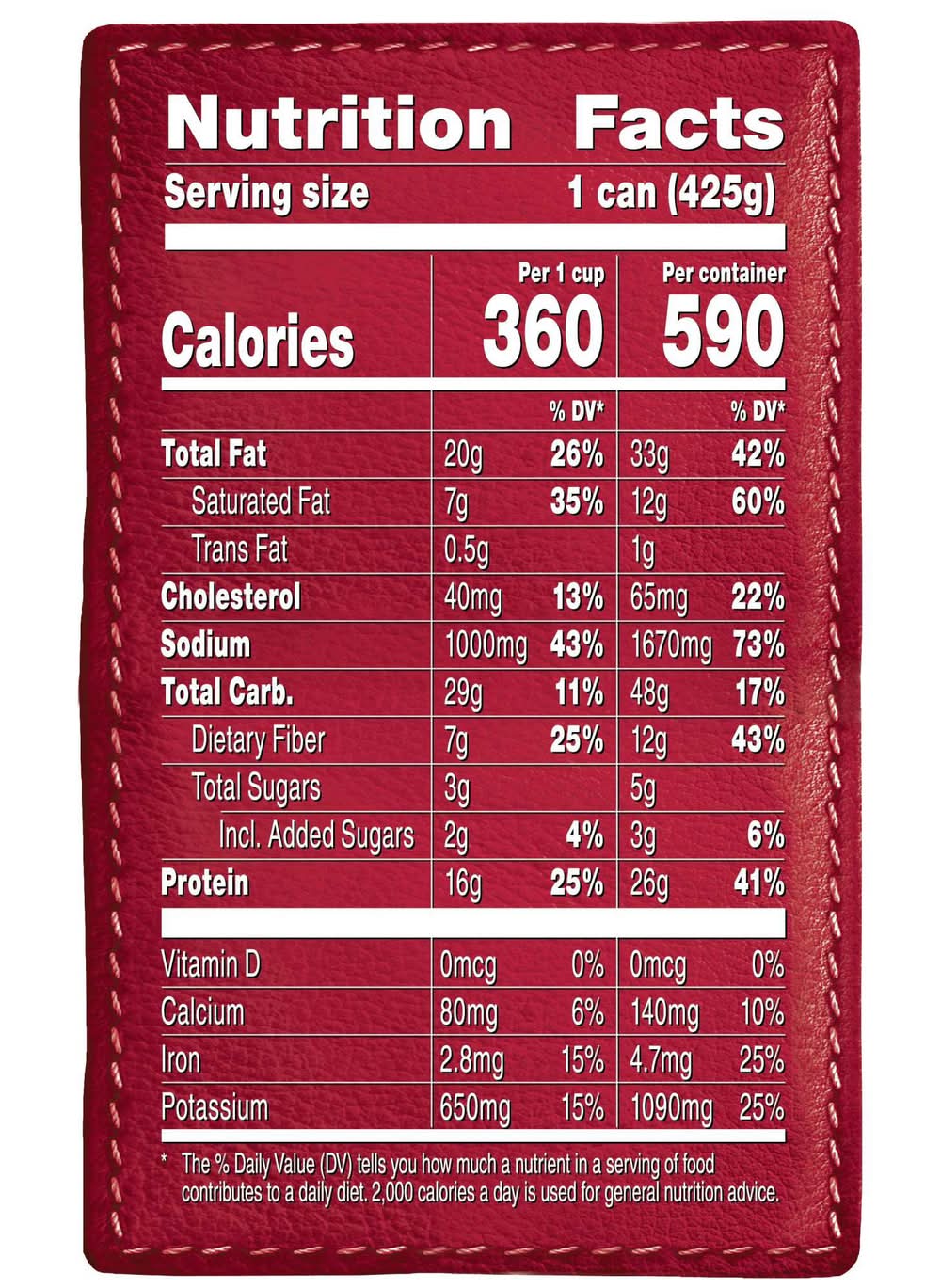 This canned chili is made with vine-ripened tomatoes, blended with bold spices, and simmered with hearty beef, pork and pinto beans to create a flavorful dish. add this chili with beans and ground beef into casserole dishes or slow cooker recipes. or serve it alone with cornbread and shredded cheese. wolf brand canned chili with beans is made with no preservatives and all-natural beef and pork, making it an excellent source of iron per serving. you can quickly heat up on the stovetop or in the microwave for an easy weeknight meal. • Conagra Brands, P.O. Box 161866, Dept. WB, Fort Worth, TX, 76161 • Packaging: Reusable