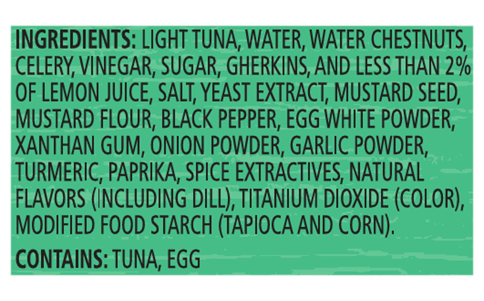 Ingredients: Light Tuna, Water, Water Chestnuts, Celery, Vinegar, Sugar, Gherkins, and Less than 2% of Lemon Juice, Salt, Yeast Extract, Mustard Seed, Mustard Flour, Black Pepper, Egg White Powder, Xanthan Gum, Onion Powder, Garlic Powder, Turmeric, Paprika, Spice Extractives, Natural Flavors (Including Dill), Titanium Dioxide (Color), Modified Food Starch (Tapioca and Corn) Contains: Fish, Tuna, Tree Nuts, Chestnuts, Celery, Mustard, Eggs, Corn