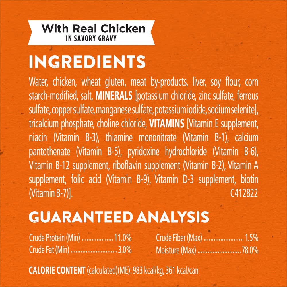 Ingredients: Real Beef In Gravy: Water, Chicken, Wheat Gluten, Meat By-Products, Liver, Beef, Soy Flour, Corn Starch-Modified, Salt, Minerals [Potassium Chloride, Zinc Sulfate, Ferrous Sulfate, Copper Sulfate, Manganese Sulfate, Potassium Iodide, Sodium Selenite], Tricalcium Phosphate, Choline Chloride, Vitamins [Vitamin E Supplement, Niacin (Vitamin B-3), Thiamine Mononitrate (Vitamin B-1), Calcium Pantothenate (Vitamin B-5), Pyridoxine Hydrochloride (Vitamin B-6), Vitamin B-12 Supplement, Riboflavin Supplement (Vitamin B-2), Vitamin A Supplement, Folic Acid (Vitamin B-9), Vitamin D-3 Supplement, Biotin (Vitamin B-7)], . C412722, Real Chicken In Gravy: Water, Chicken, Wheat Gluten, Meat By-Products, Liver, Soy Flour, Corn Starch-Modified, Salt, Minerals [Potassium Chloride, Zinc Sulfate, Ferrous Sulfate, Copper Sulfate, Manganese Sulfate, Potassium Iodide, Sodium Selenite], Tricalcium Phosphate, Choline Chloride, Vitamins [Vitamin E Supplement, Niacin (Vitamin B-3), Thiamine Mononitrate (Vitamin B-1), Calcium Pantothenate (Vitamin B-5), Pyridoxine Hydrochloride (Vitamin B-6), Vitamin B-12 Supplement, Riboflavin Supplement (Vitamin B-2), Vitamin A Supplement, Folic Acid (Vitamin B-9), Vitamin D-3 Supplement, Biotin (Vitamin B-7)], . C412822