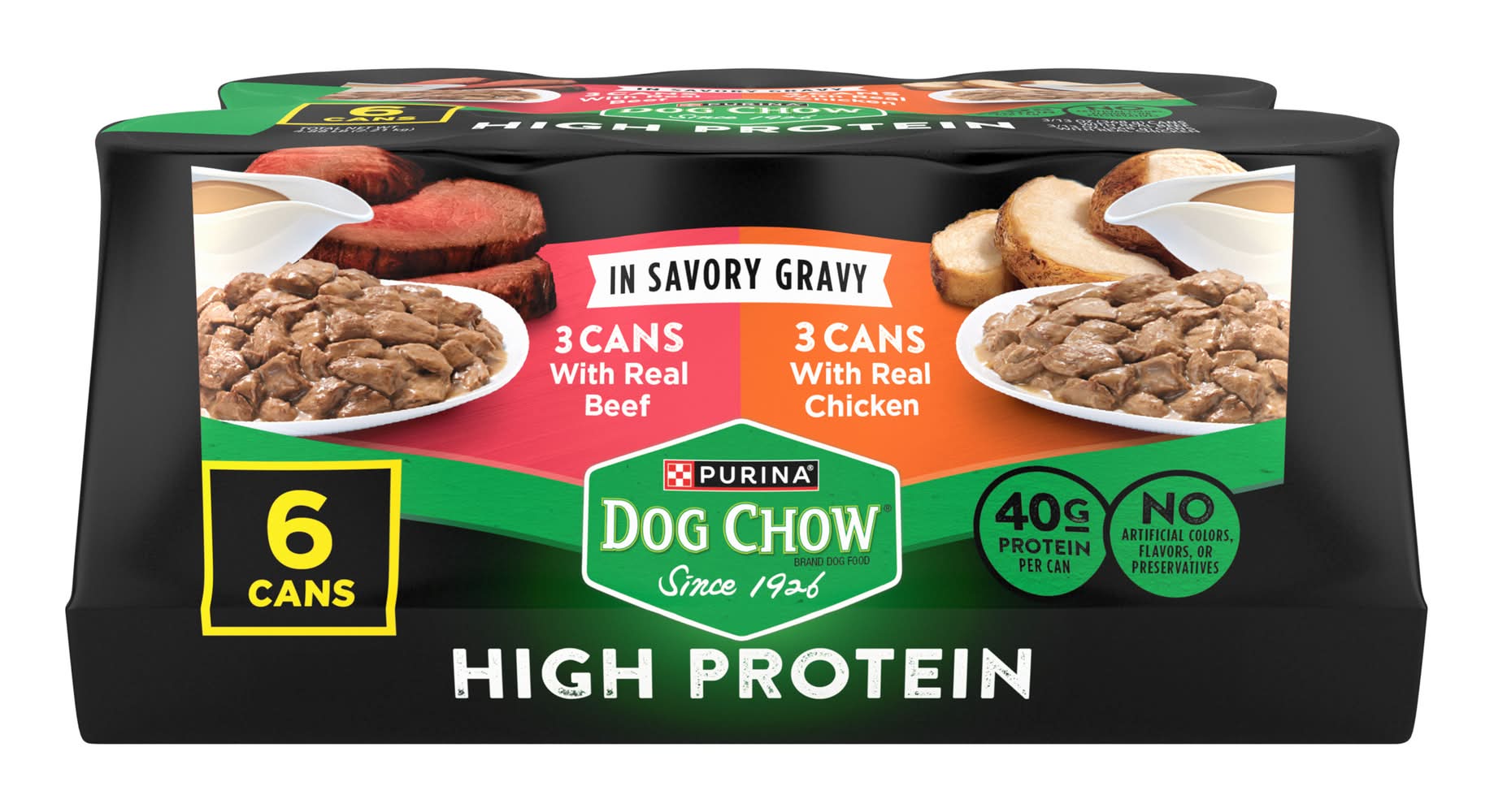 Give your best friend the meaty beef or chicken flavors he loves with this Purina Dog Chow High Protein With Real Chicken or With Real Beef in Savory Gravy Wet Dog Food Variety Pack. Providing your canine with high protein at every meal, each can in this Purina Dog Chow with beef or with chicken dog food variety pack delivers 40 grams of protein to help support strong muscles. These delicious dog foods with high protein are made with real beef or real chicken and topped with savory dog food gravy for added moisture. Open a can of this wet food for dogs and wait for his nose to pick up the delectable aroma as he bounds for his dish. Each serving gives your adult dog the 100 percent complete and balanced nutrition his body needs without artificial colors, flavors or preservatives, so you can feel good about serving him a well-rounded meal made with real ingredients. Fulfill his passion for chicken and beef with the two different recipes in this variety pack to keep his palate happy.