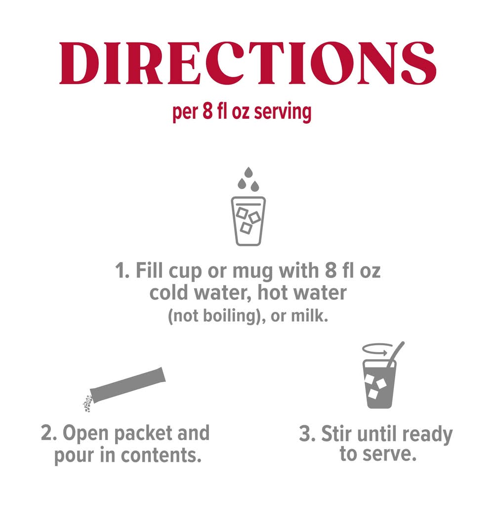 Directions: per 8 fl oz serving. 1. fill cup or mug with 8 fl oz cold water, hot water (not boiling), or milk. 2. open packet and pour in contents. 3. stir until ready to serve. enjoy cold. enjoy hot.