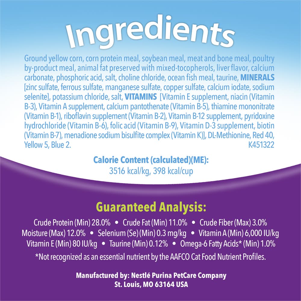 Ingredients: Ground Yellow Corn, Corn Protein Meal, Soybean Meal, Meat And Bone Meal, Poultry By-Product Meal, Animal Fat Preserved With Mixed-Tocopherols, Liver Flavor, Calcium Carbonate, Phosphoric Acid, Salt, Choline Chloride, Ocean Fish Meal, Taurine, MINERALS [Zinc Sulfate, Ferrous Sulfate, Manganese Sulfate, Copper Sulfate, Calcium Iodate, Sodium Selenite], Potassium Chloride, Salt, VITAMINS [Vitamin E Supplement, Niacin (Vitamin B-3), Vitamin A Supplement, Calcium Pantothenate (Vitamin B-5), Thiamine Mononitrate (Vitamin B-1), Riboflavin Supplement (Vitamin B-2), Vitamin B-12 Supplement, Pyridoxine Hydrochloride (Vitamin B-6), Folic Acid (Vitamin B-9), Vitamin D-3 Supplement, Biotin (Vitamin B-7), Menadione Sodium Bisulfite Complex (Vitamin K)], DL-Methionine, Red 40, Yellow 5, Blue 2. K451322