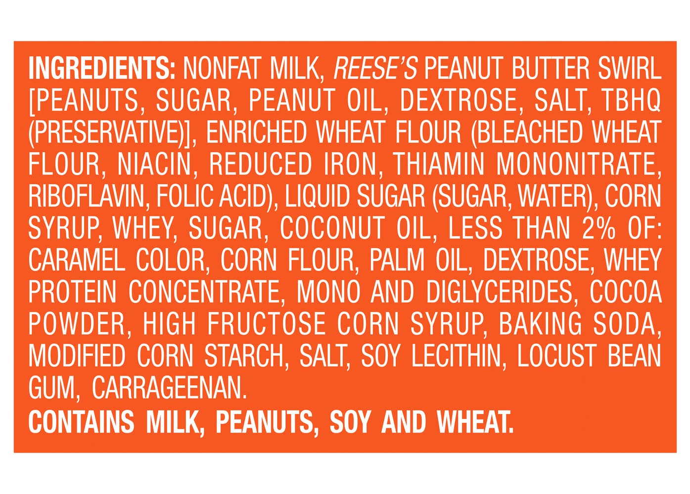 Ingredients: Nonfat Milk, Reese's Peanut Butter Swirl [Peanuts, Sugar, Peanut Oil, Dextrose, Salt, TBHQ (Preservative)], Enriched Wheat Flour (Bleached Wheat Flour, Niacin, Reduced Iron, Thiamin Mononitrate, Riboflavin, Folic Acid), Liquid Sugar (Sugar, Water), Corn Syrup, Whey, Sugar, Coconut Oil, Less than 2% of: Caramel Color, Corn Flour, Palm Oil, Dextrose, Whey Protein Concentrate, Mono and Diglycerides, Cocoa Powder, High Fructose Corn Syrup, Baking Soda, Modified Corn Starch, Salt, Soy Lecithin, Locust Bean Gum, Carrageenan Contains: Milk, Peanuts, Soybeans, Wheat, Corn, Tree Nuts, Coconuts