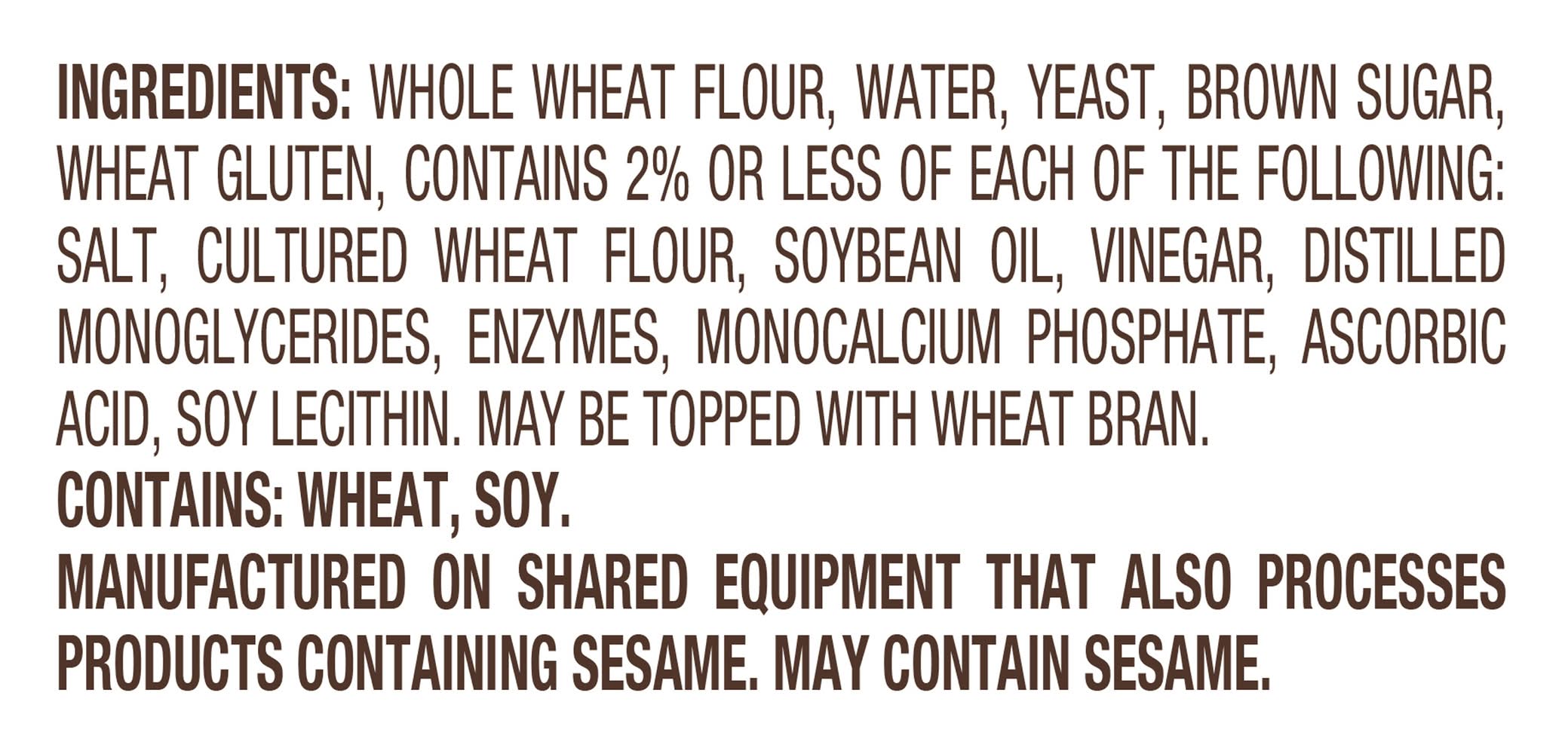 Ingredients: Whole Wheat Flour, Water, Yeast, Brown Sugar, Wheat Gluten, Contains 2% or Less of Each of the Following: Salt, Cultured Wheat Flour, Soybean Oil, Vinegar, Distilled Monoglycerides, Enzymes, Monocalcium Phosphate, Ascorbic Acid, Soy Lecithin, May Be Topped with Wheat Bran Contains: Wheat, Soybeans, Gluten, Sesame