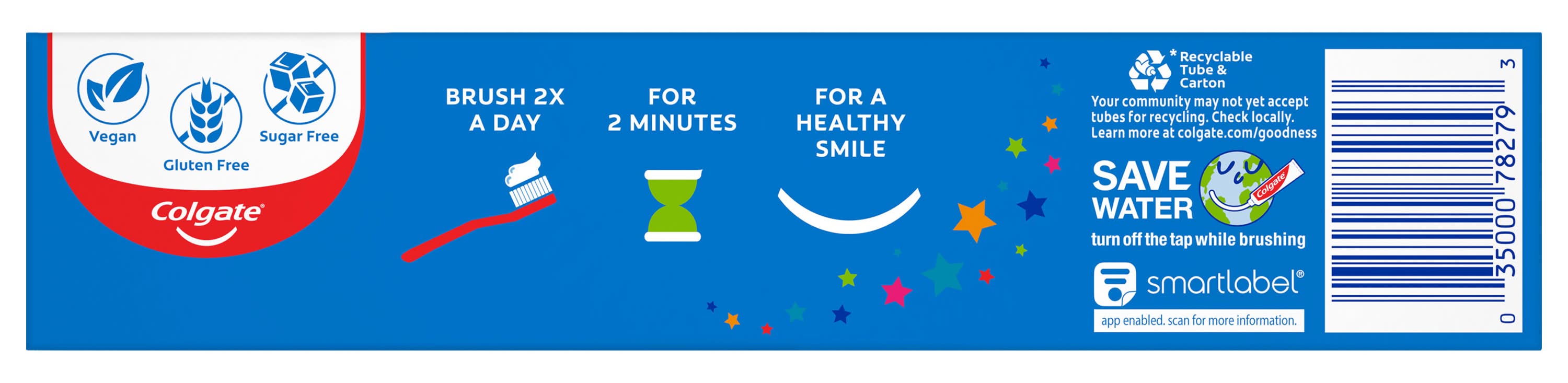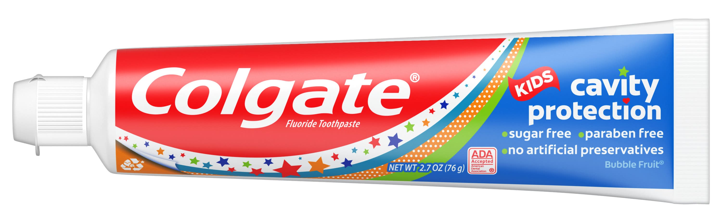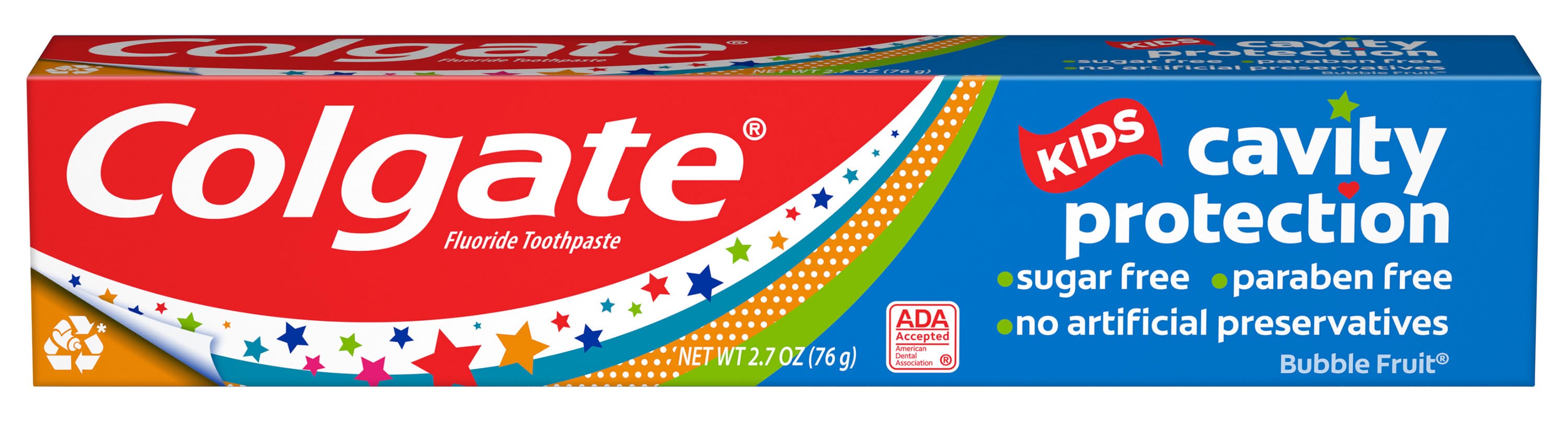 Colgate® Kids Cavity Protection Toothpaste, with a great bubble fruit flavor, is gentle on tooth enamel and clinically proven to fight cavities. Plus, it has a bubble fruit flavor that encourages regular brushing for a lifetime of bright smiles. This Colgate Kids Cavity Protection Toothpaste is ADA (American Dental Association) accepted. This kids toothpaste is also gluten- and sugar-free. Colgate-Palmolive Company, New York, NY, 10022, Ph: 800-468-6502