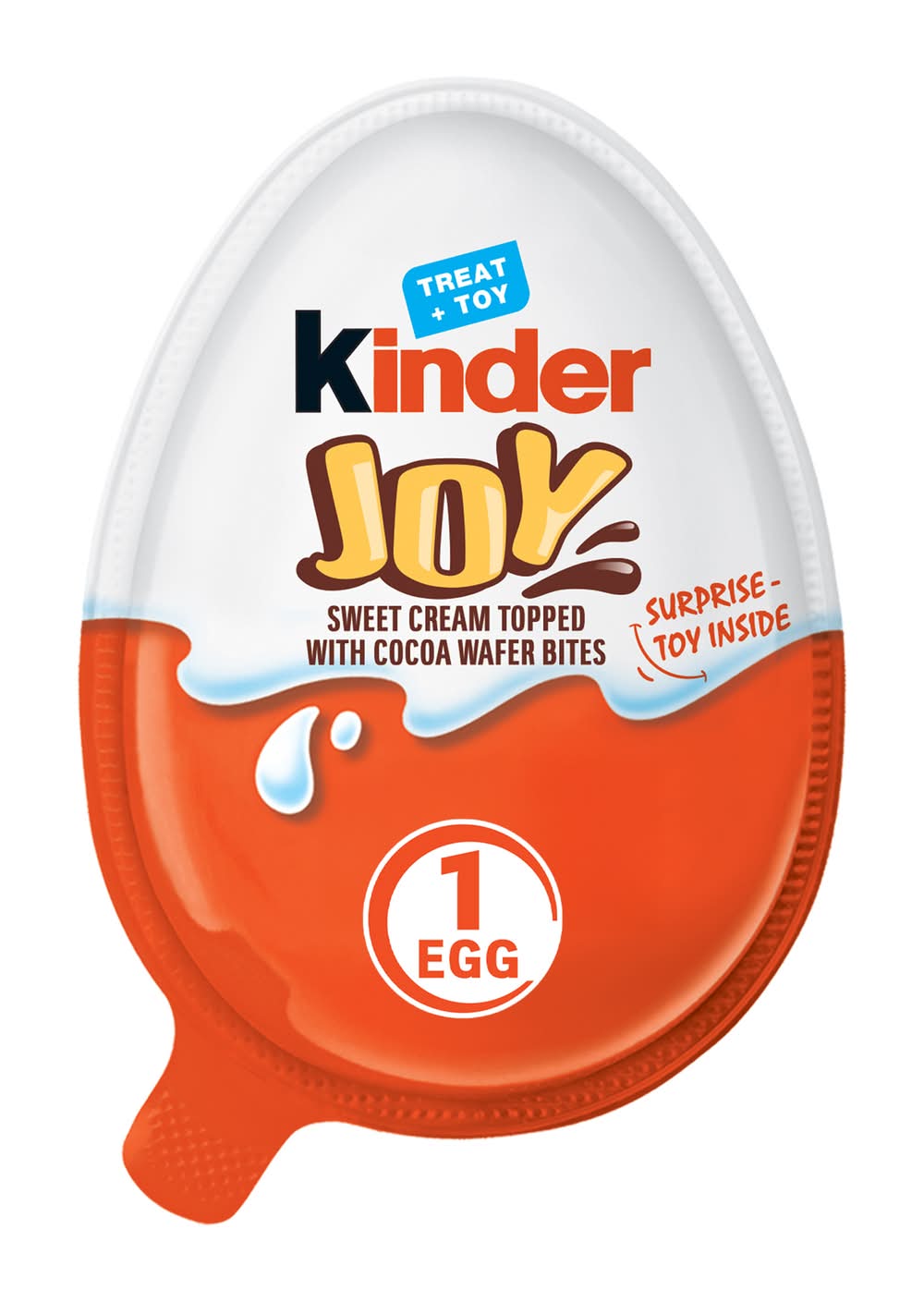 Treat + Toy, Twice the Joy Discover the two sides of irresistible fun in a Kinder Joy egg. The treat side of the egg features two layers of creamy deliciousness one cocoa and one sweet cream. Plus, there are two crispy, chocolatey-covered wafer bites filled with cocoa cream. The toy side of the egg hides a surprise toy that kids and parents are sure to love. Individually wrapped, each egg features one of over 100 unique toys. So even when the treat is gone, the fun can still play on. Ferrero USA, Inc., Parsipanny,NJ,ZIP:07054,
