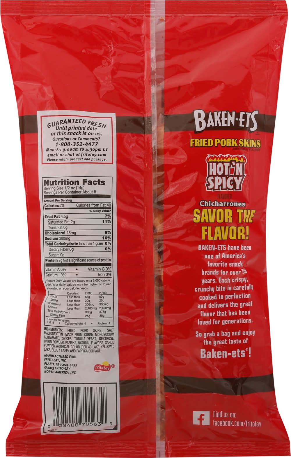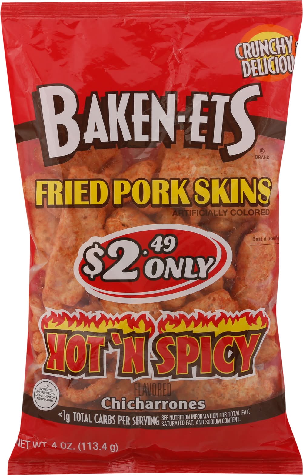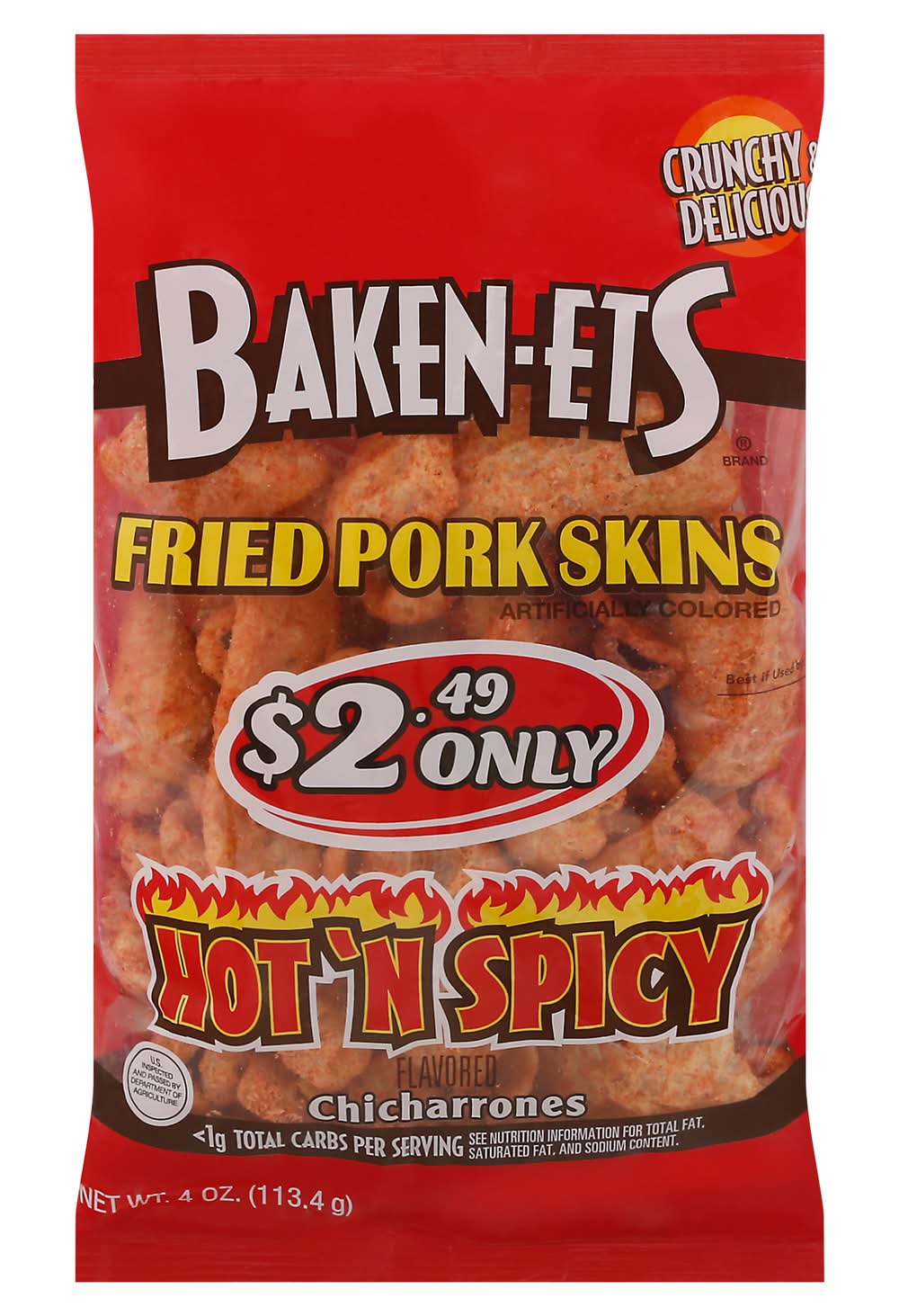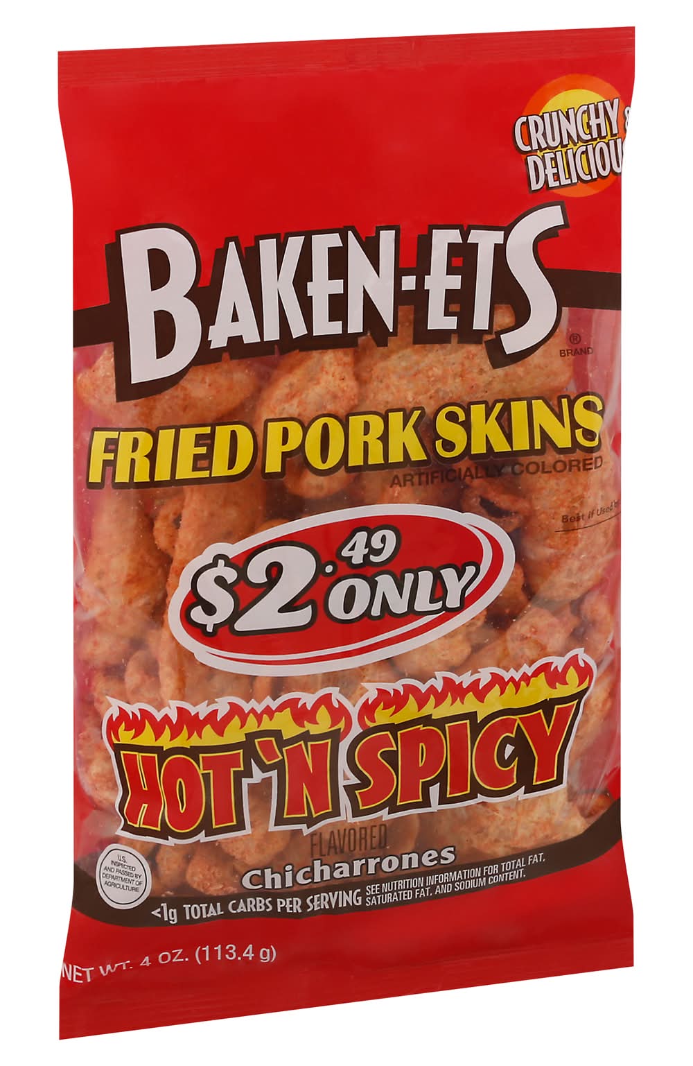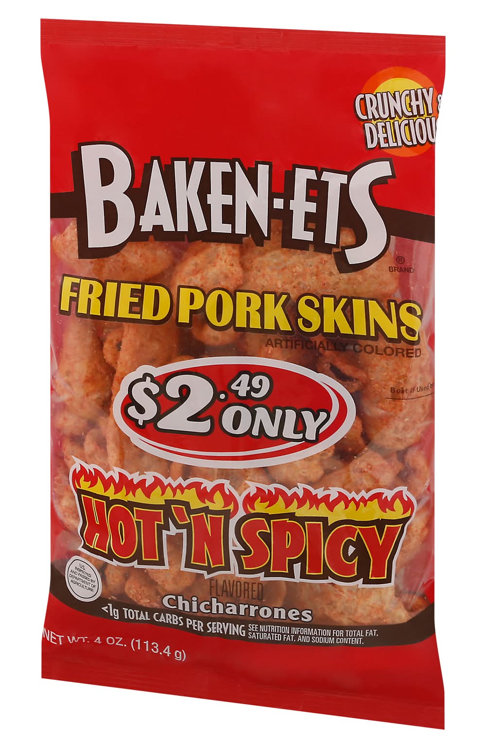 Fried Pork Skins. Less than 1 g total carbs per serving. See nutrition information for total fat, saturated fat, and sodium content. Crunchy & delicious. Artificially colored. Savor the flavor! Baken-ets have been one of America's favorite snack brands for over 50 years. Each crispy, crunchy bite is carefully cooked to perfection and delivers the great flavor that has been loved for generations. So grab a bag and enjoy the great taste of Baken-ets! Guaranteed fresh until printed date or this snack's on us. U.S. Inspected and passed by Department of Agriculture. Flavor: Hot 'n spicy