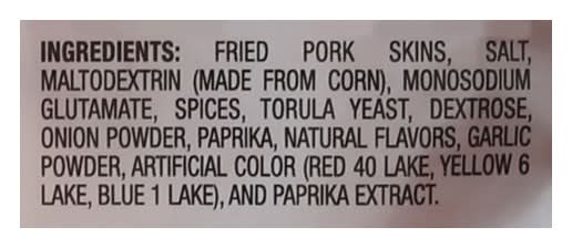Ingredients: Fried Pork Skins, Salt, Maltodextrin (Made from Corn), Monosodium Glutamate, Spices, Torula Yeast, Dextrose, Onion Powder, Paprika, Natural Flavors, Garlic Powder, Artificial Color (Red 40 Lake, Yellow 6 Lake, Blue 1 Lake), and Paprika Extract Contains: Corn