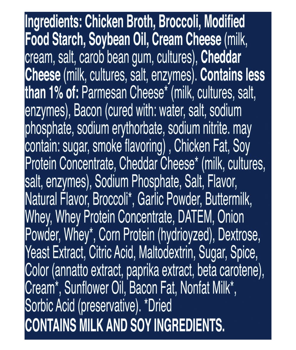 Ingredients: Chicken Broth, Broccoli, Modified Food Starch, Soybean Oil, Cream Cheese (Milk, Cream, Salt, Carob Bean Gum, Cultures), Cheddar Cheese (Milk, Cultures, Salt, Enzymes), Contains Less than 1% of: Parmesan Cheese (Dried) (Milk, Cultures, Salt, Enzymes), Bacon (Cured with: Water, Salt, Sodium Phosphate, Sodium Erythorbate, Sodium Nitrite, May Contain: Sugar, Smoke Flavoring), Chicken Fat, Soy Protein Concentrate, Cheddar Cheese (Dried) (Milk, Cultures, Salt, Enzymes), Sodium Phosphate, Salt, Flavor, Natural Flavor, Broccoli (Dried), Garlic Powder, Buttermilk, Whey, Whey Protein Concentrate, DATEM, Onion Powder, Whey (Dried), Corn Protein (Hydrioyzed), Dextrose, Yeast Extract, Citric Acid, Maltodextrin, Sugar, Spice, Color (Annatto Extract, Paprika Extract, Beta Carotene), Cream (Dried), Sunflower Oil, Bacon Fat, Nonfat Milk (Dried), Sorbic Acid (Preservative) Contains: Milk, Soybeans, Corn