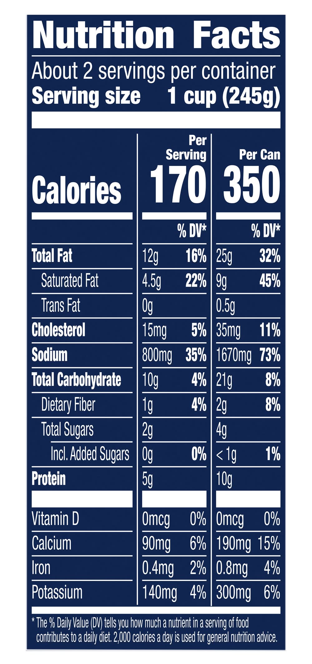 Flavored with other natural flavor. Per 1 Cup Serving: 170 calories, 4.5 g sat fat (23% DV), 800 mg sodium (35% DV), 2 g total sugars. Gluten free. Contains bioengineered food ingredients lean more. For over 100 years, our kitchens have crafted honest, soul-satisfying recipes with real ingredients you're proud to serve. No colors from artificial sources. • General Mills Sales, Inc., Minneapolis,MN,55440 • Packaging: Reusable