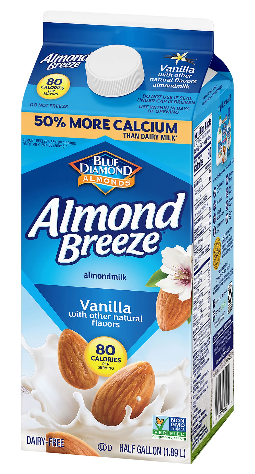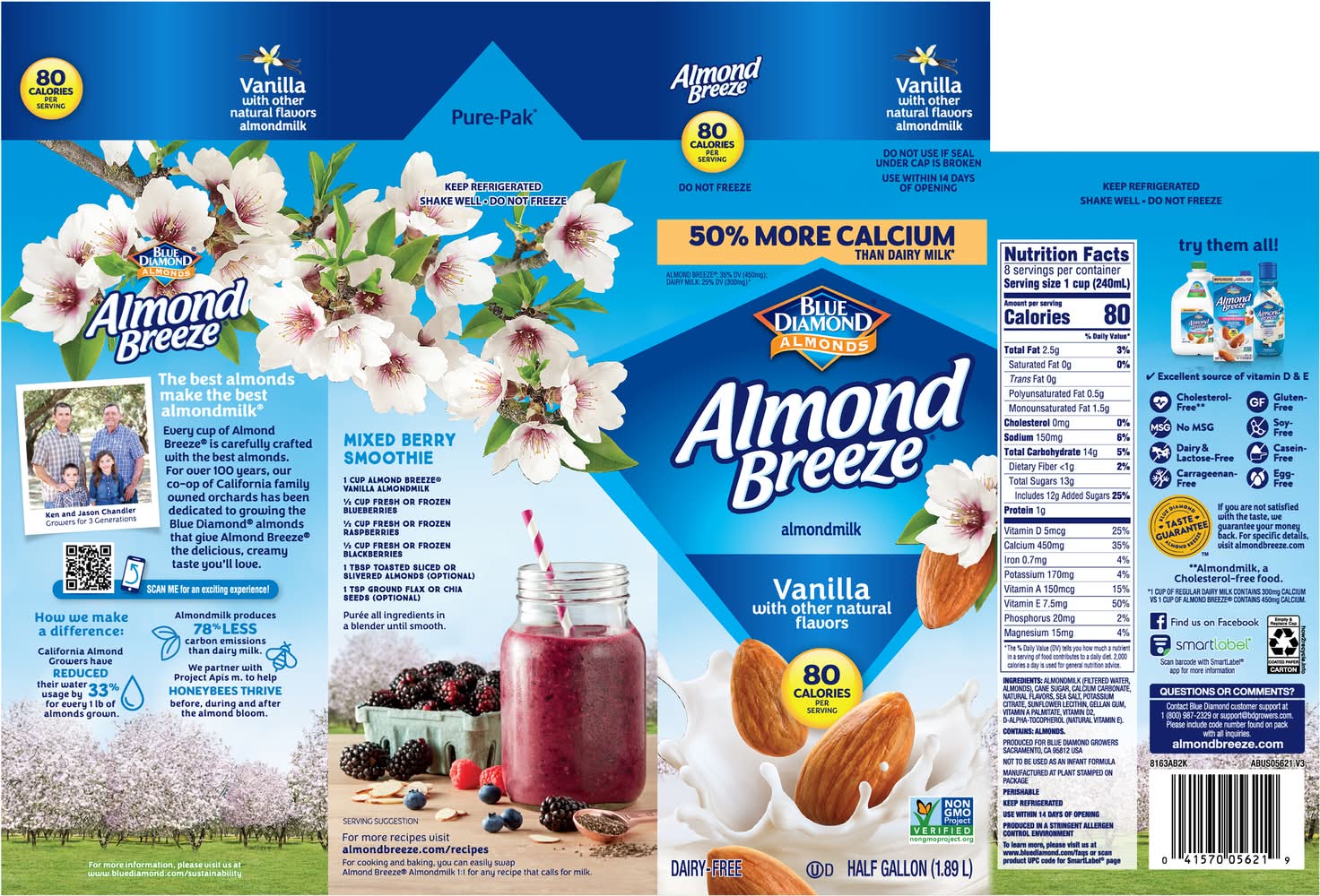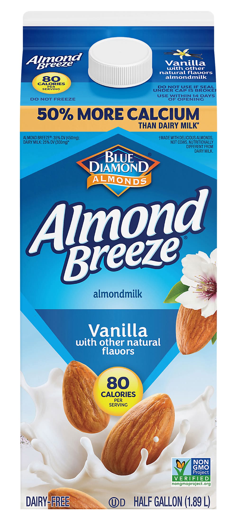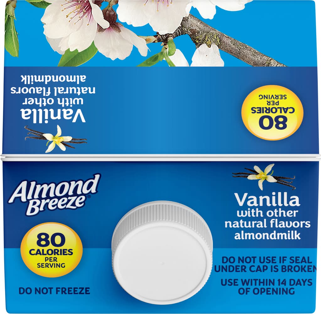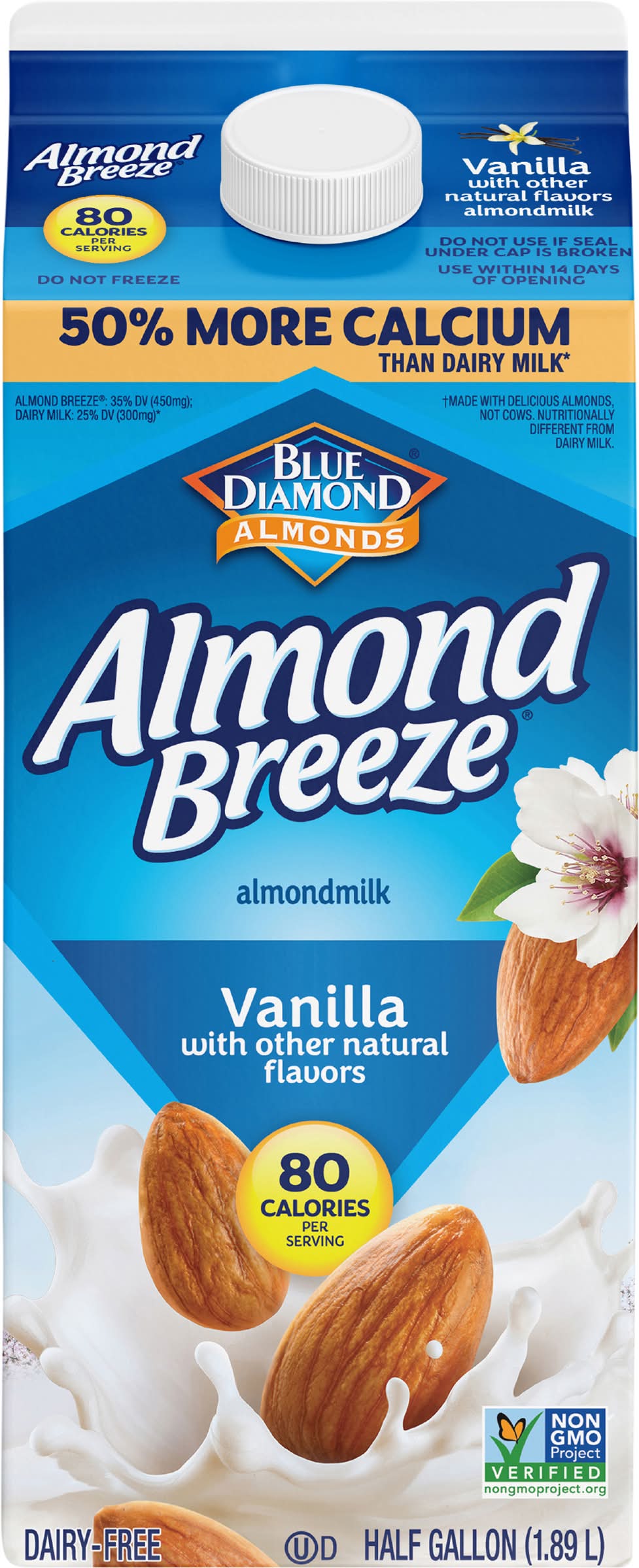 Almond Breeze non-dairy almondmilk is delicious in everything, from cereals and smoothies to cooking and baking. Browse our variety of refrigerated and shelf stable almondmilk, including sweetened and unsweetened, vanilla, chocolate, our coconut and banana almondmilk blends, as well as almondmilk creamers and almondmilk yogurts. The best almonds make the best almondmilk. • Flavor: Vanilla • HP Hood, Sacramento, CA, 95812. • Packaging: Reusable