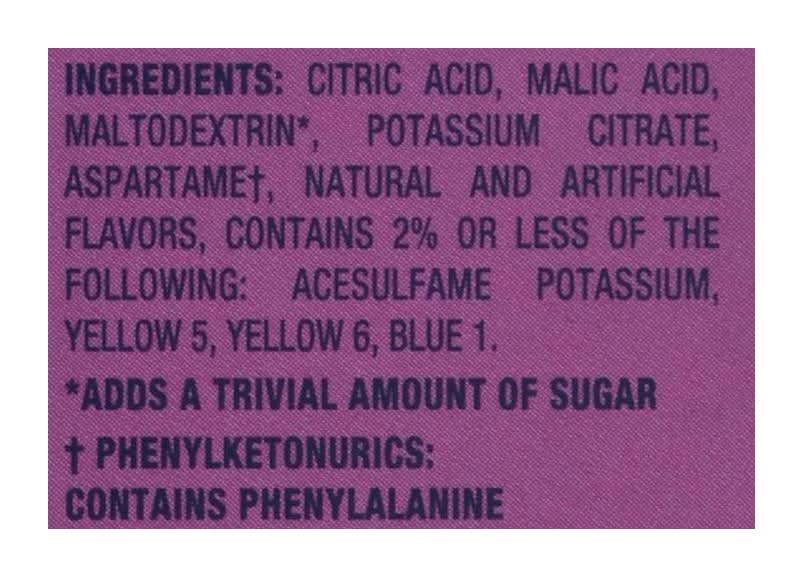 Ingredients: Citric Acid, Malic Acid, Potassium Citrate, Maltodextrin (Add a Trivial Amount of Sugar), Aspartame (Phenylketonurics: Contains Phenylalanine), Natural and Artificial Flavors, Contains 2% or Less of the Following: Acesulfame Potassium, Yellow 5, Yellow 6, Blue 1
