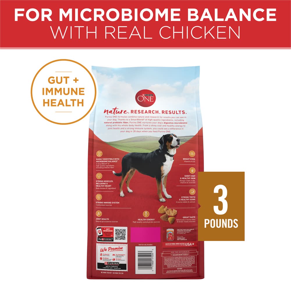 Give your dog a tasty meal inspired by the science of nature by serving Purina ONE Chicken and Rice Dog Food Formula Natural With Added Vitamins, Minerals and Nutrients adult dry dog food. Real chicken as the number 1 ingredient in this Purina ONE dry dog food recipe, and other high-quality protein sources support strong muscles, including a healthy heart, while natural sources of glucosamine for dogs help nourish healthy joints. Protein-rich, tender, meaty morsels and crunchy dog kibble deliver a texture your dog can't resist, and an adult dog food formula made with 0 percent fillers means that every ingredient has a purpose. With its highly digestible formula, this wholesome recipe helps ensure more nutrition goes to work inside your dog while its prebiotic fiber nourishes gut health. Rest easy knowing he's getting 100 percent complete and balanced nutrition for adult dogs to boost his lifelong whole-body health, and watch as he delights in every bite of this Purina ONE Dry Dog Food.
