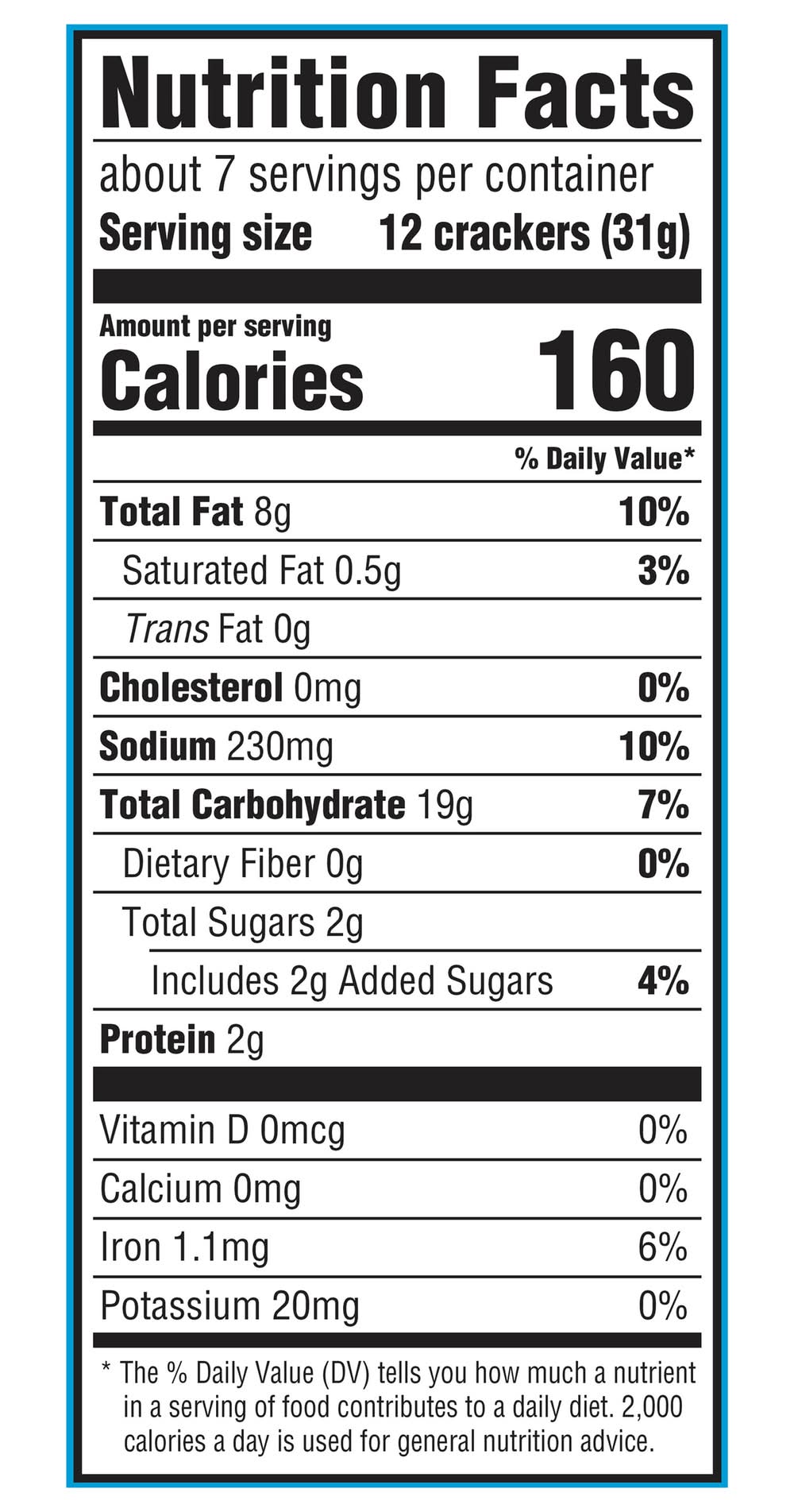 These baked crackers have an enjoyable crunchy texture and a seasoning that contains chicken that makes them a delicious savory snack. Enjoy these flavored crackers on their own, serve these cracker snacks with soup or salad, or pair these savory crackers with your favorite dips and spreads. Serve them as party snacks by creating a fun charcuterie board with these tasty crackers alongside meat, cheese, and vegetables; it's an easy appetizer tray for the holidays or anytime! A wonderful snack food to pack in lunchboxes and backpacks as a crunchy snack companion to sandwiches, these delicious crackers make fantastic lunch snacks, office snacks, and after-work and after-school snacks. Toss a box in the car for travel snacks, and keep one in the pantry for movie snacks to enjoy during family movie night. These baked snack crackers come in sealed packaging to keep crackers fresh and crunchy until you're ready to enjoy them • Mondelez Global LLC, East Hanover, NJ, 07936 • Packaging: Reusable