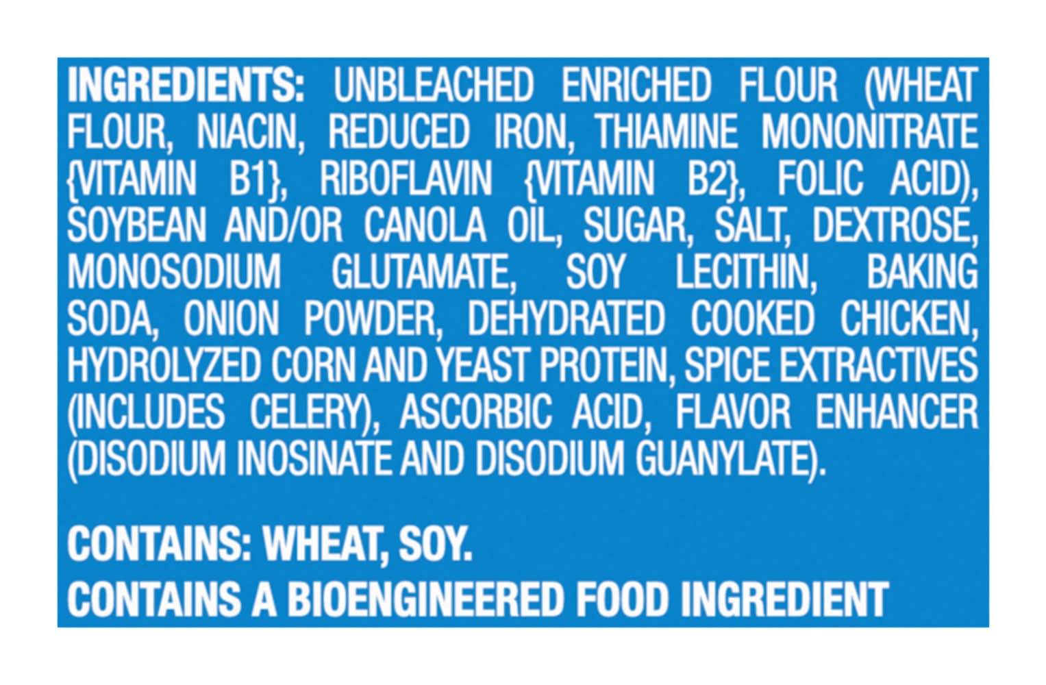 Ingredients: INGREDIENTS: UNBLEACHED ENRICHED FLOUR (WHEAT FLOUR, NIACIN, REDUCED IRON, THIAMINE MONONITRATE {VITAMIN B1}, RIBOFLAVIN {VITAMIN B2}, FOLIC ACID), SOYBEAN AND, OR CANOLA OIL, SUGAR, SALT, DEXTROSE, MONOSODIUM GLUTAMATE, SOY LECITHIN, BAKING SODA, ONION POWDER, DEHYDRATED COOKED CHICKEN, HYDROLYZED CORN AND YEAST PROTEIN, SPICE EXTRACTIVES (INCLUDES CELERY), ASCORBIC ACID, FLAVOR ENHANCER (DISODIUM INOSINATE AND DISODIUM GUANYLATE), .CONTAINS: WHEAT, SOY. Contains: CONTAINS: WHEAT, SOY.