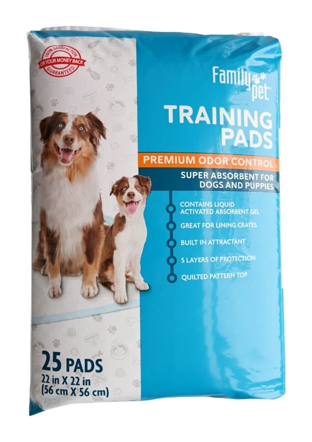 Perfect potty pads for pups provide peace and practicality Family Pet Odor Control Puppy Training Pads are a great way to house train your pets and protect your floors. Simply entice your pet to approach the pad the built-in attractant helps here, engage with it, and finally encourage them to use it. The super-absorbent core turns liquid to gel upon contact and the leak-proof plastic lining keeps your floors safe from any damage as well as reduces tearing and shredding. For easy clean-up, these pads are easily replaceable and disposable. Excellent for new puppies, senior dogs, dogs with limited access to the outdoors, sick dogs, rainy or stormy days, car rides you're covered in all situations. Size: 22x22 in