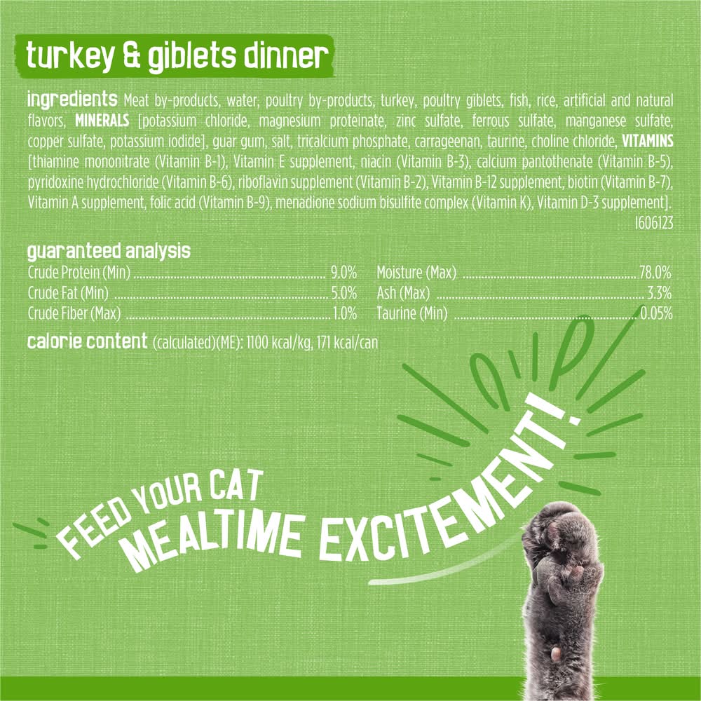 Ingredients: Artificial and Natural Flavors, Tricalcium Phosphate, Mono and Dicalcium Phosphate, Thiamine Mononitrate Vitamin B-1, Folic Acid Vitamin B-9, Red 3, Sodium Nitrite to Promote Color Retention, Mixed Grill: Meat By-Products, Liver, Artificial and Natural Flavors, Tricalcium Phosphate, Folic Acid Vitamin B-9, Turkey & Giblets Dinner: Meat By-Products, Poultry Giblets, Artificial and Natural Flavors, Tricalcium Phosphate, Folic Acid Vitamin B-9, Tricalcium Phosphate, Mono And Dicalcium Phosphate, Thiamine Mononitrate Vitamin B-1, Folic Acid Vitamin B-9, Red 3, Liver, Tricalcium Phosphate, Folic Acid Vitamin B-9, Poultry Giblets, Tricalcium Phosphate, Folic Acid Vitamin B-9, Vitamin D-3 Supplement]. F606118, Water, Rice, Chicken, Taurine, Choline Chloride, Guar Gum, Poultry By-Products, Vitamins [Thiamine Mononitrate Vitamin B-1, Pyridoxine Hydrochloride Vitamin B-6, Manganese Sulfate, Potassium Iodide, Added Color, Fish, Salt, Zinc Sulfate, Ferrous Sulfate, Copper Sulfate, Vitamin B-12 Supplement, Magnesium Sulfate, Biotin Vitamin B-7, Niacin Vitamin B-3, Vitamin A Supplement, Calcium Pantothenate Vitamin B-5, Vitamin D-3 Supplement, Vitamin E Supplement, Salmon, Carrageenan, Riboflavin Supplement Vitamin B-2 Contains: Fish, Sulfites