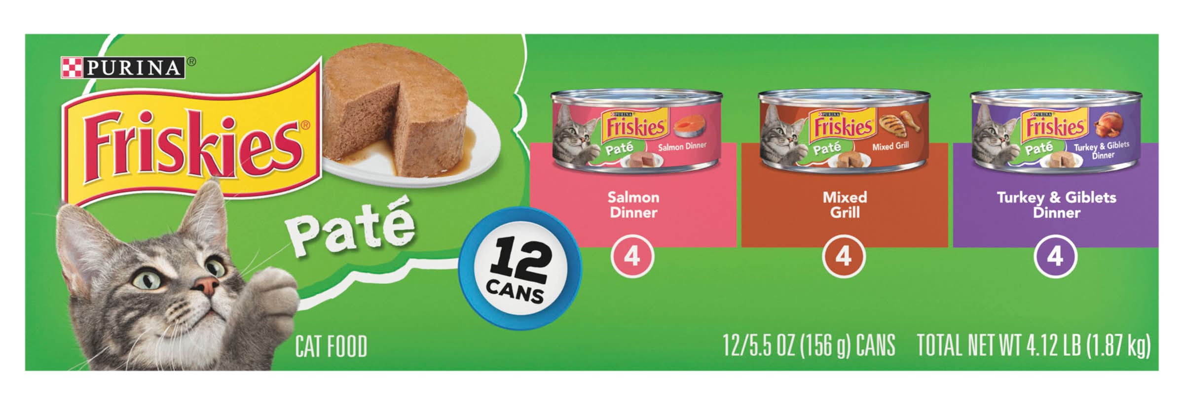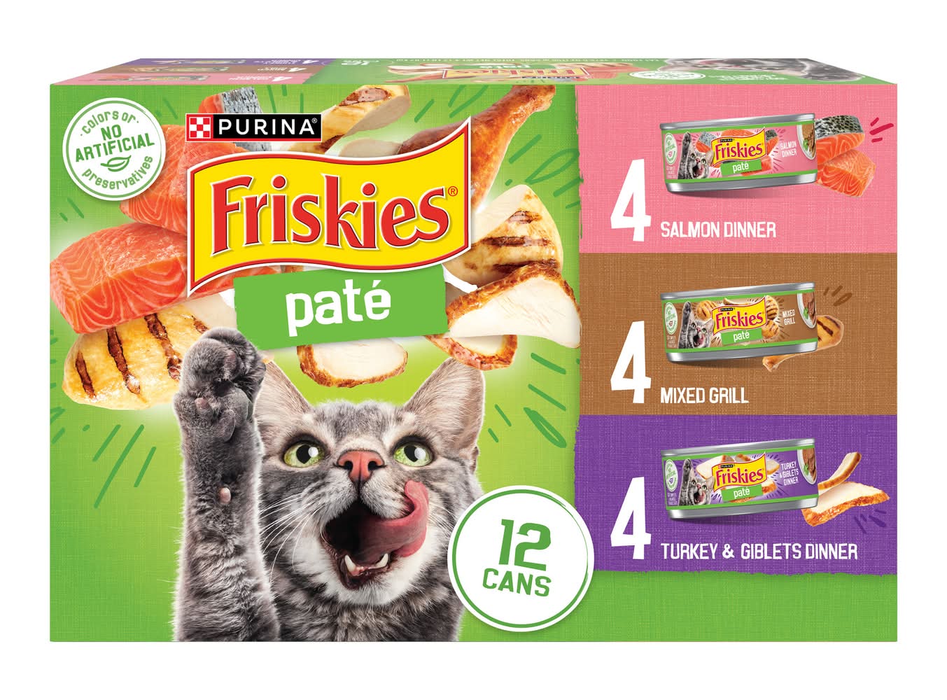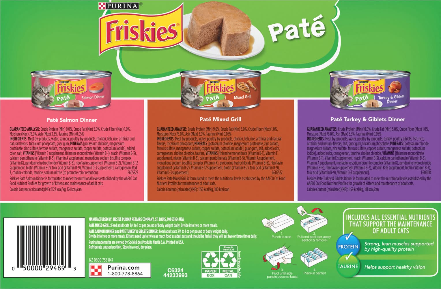 Fill your pantry with this Purina Friskies Pate wet canned cat food variety pack, and let your cat select her favorite pate cat food flavors for every feeding. With chicken, turkey or salmon adult cat food options deliver all the tastes she craves, and the smooth cat food wet pate texture found in every can is pleasing to her palate. Let the fragrant aroma of each Friskies canned cat food recipe lead her to her dish in anticipation of a mouthwatering meal and watch as she happily savors every nibble. Each Friskies cat food serving is 100 percent complete and balanced for adult cats with no artificial colors or preservatives, providing the essential nutrients and healthy hydration she needs to help support her overall health and wellness. Offer her a different selection from this Friskies canned cat food pate variety pack at every feeding and surprise her taste buds with yummy flavor and wholesome goodness. • Pack size: 12 • Nestle, St. Louis,MO,63164,USA • Packaging: Reusable
