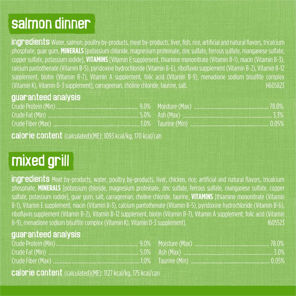 Pate mixed grill feeding directions: feed adult cats 3/4 - 1 oz per pound of body weight daily. divide into two or more meals. pate salmon dinner and pate giblets dinner: feed adult cats 3/4 - 1 oz per pound of body weight daily. divide into two or more meals. kittens need up to twice as much food as adult cats and should be fed all they will eat two or three times daily.