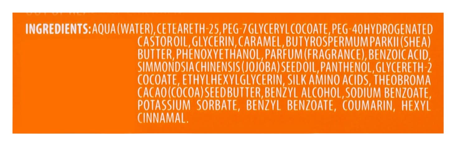 Ingredients: Aqua (Water), Ceteareth-25, PEG-7 Glyceryl Cocoate, PEG-40 Hydrogenated Castor Oil, Glycerin, Caramel, Butyrospermum Parkii (Shea) Butter, Phenoxyethanol, Parfum (Fragrance), Benzoic Acid, Simmondsia Chinensis (Jojoba) Seed Oil, Panthenol, Glycereth-2 Cocoate, Ethylhexylglycerin, Silk Amino Acids, Theobrama Cacao (Cocoa) Seed Butter, Benzyl Alcohol, Sodium Benzoate, Potassium Sorbate, Benzyl Benzoate, Coumarin, Hexyl Cinnamal Contains: Tree Nuts, Sheanuts