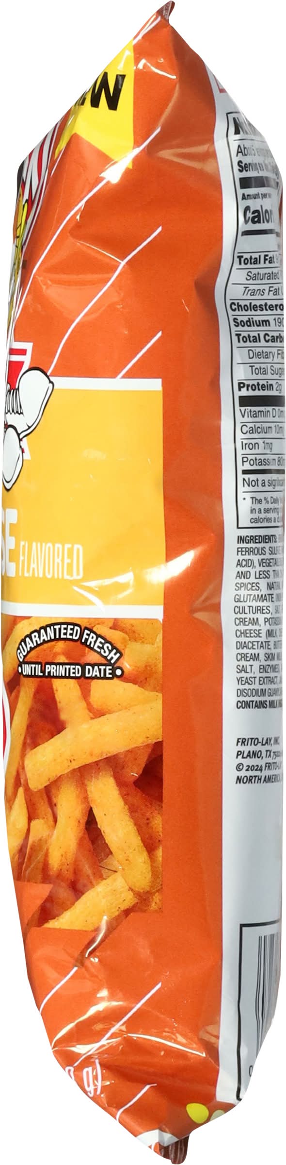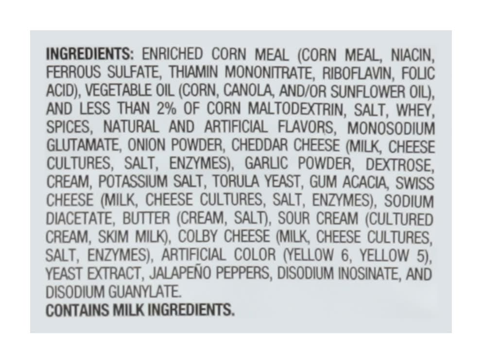 Ingredients: Enriched Corn Meal (Corn Meal, Niacin, Ferrous Sulfate, Thiamin Mononitrate, Riboflavin, Folic Acid), Vegetable Oil (Corn, Canola, and/or Sunflower Oil), and Less than 2% of Corn Maltodextrin, Salt, Whey, Spices, Natural and Artificial Flavors, Monosodium Glutamate, Onion Powder, Cheddar Cheese (Milk, Cheese Cultures, Salt, Enzymes), Garlic Powder, Dextrose, Cream, Potassium Salt, Torula Yeast, Gum Acacia, Swiss Cheese (Milk, Cheese Cultures, Salt, Enzymes), Sodium Diacetate, Butter (Cream, Salt), Sour Cream (Cultured Cream, Skim Milk), Colby Cheese (Milk, Cheese Cultures, Salt, Enzymes), Artificial Color (Yellow 6, Yellow 5), Yeast Extract, Jalapeño Peppers, Disodium Inosinate, and Disodium Guanylate Contains: Milk