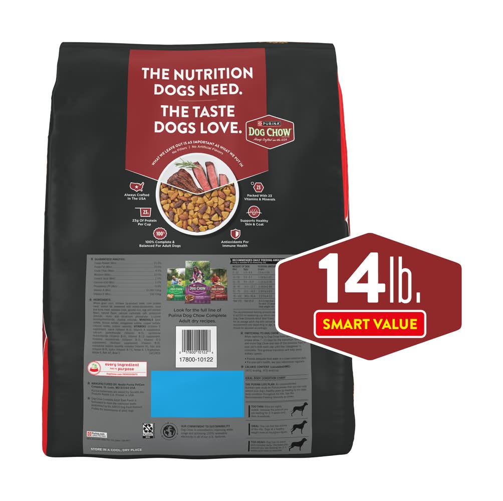 Give your dog the nutrition they need with the taste they love by serving Purina Dog Chow Complete Adult Beef Flavor dry dog food. This delicious adult dog food recipe is made with high-quality ingredients, giving them a wholesome dog food meal option that you can both feel good about. With 23 essential vitamins and minerals in every serving, this kibble dog food helps support your dog's overall health and wellness. Crafted without artificial flavors, this Purina dry dog food recipe provides 100 percent complete and balanced nutrition that adult dogs need and supports immune health. High-quality protein for dogs in every serving helps support your dog's strong muscles to maintain an active lifestyle. This Purina Dog Chow Complete adult dog food is carefully crafted by employees who trust it enough to feed it to their own dogs. Tempt your dog to their dish with the delightful flavors found in this dry dog kibble recipe, and rest easy knowing they’re getting a nutritious meal.