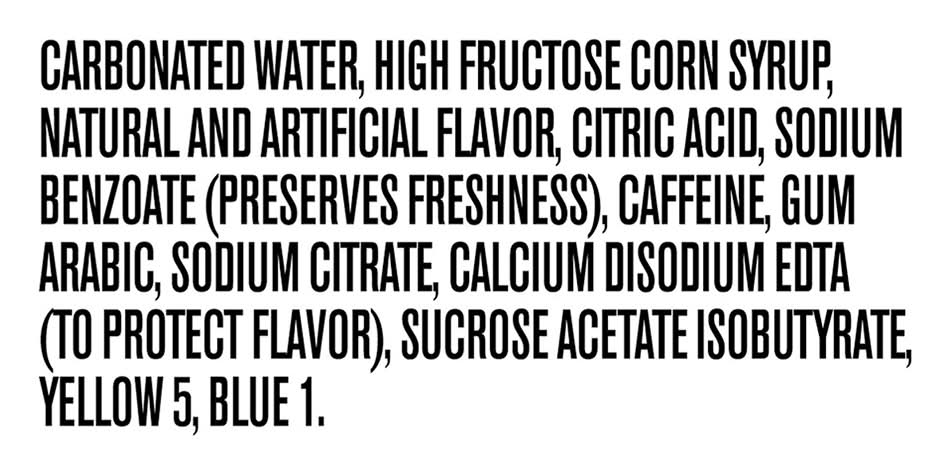 Ingredients: Carbonated Water, High Fructose Corn Syrup, Natural and Artificial Flavor, Citric Acid, Sodium Benzoate (Preserves Freshness), Caffeine, Gum Arabic, Sodium Citrate, Calcium Disodium EDTA (to Protect Flavor), Sucrose Acetate Isobutyrate Yellow 5, Blue 1 Contains: Corn