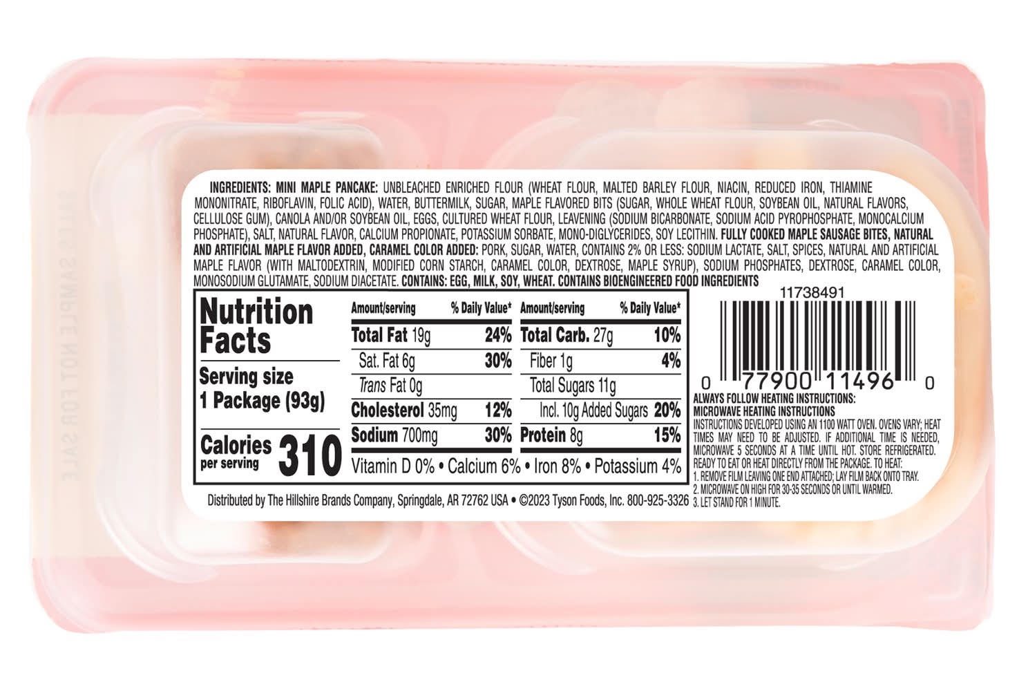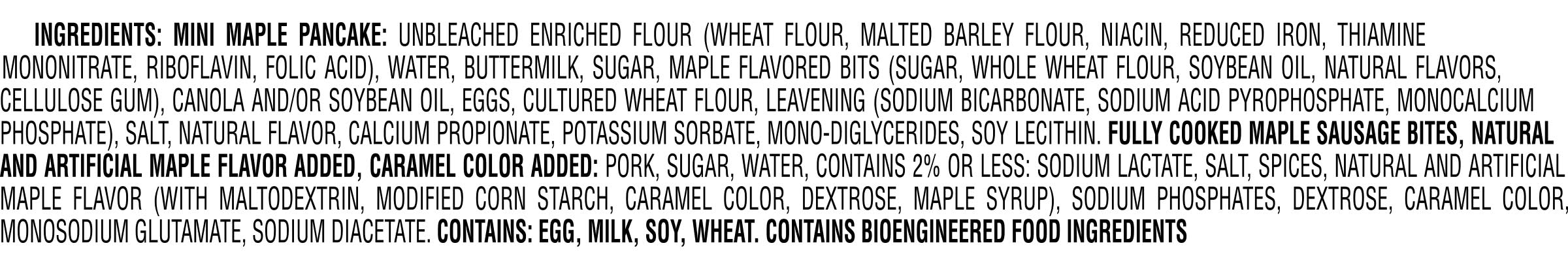 Ingredients: Mini Maple Pancake: Unbleached Enriched Flour (Wheat Flour, Malted Barley Flour, Niacin, Reduced Iron, Thiamine Mononitrate, Riboflavin, Folic Acid), Water, Buttermilk, Sugar, Maple Flavored Bits (Sugar, Whole Wheat Flour, Soybean Oil, Natural Flavors, Cellulose Gum), Canola and/or Soybean Oil, Eggs, Cultured Wheat Flour, Leavening (Sodium Bicarbonate, Sodium Acid Pyrophosphate, Monocalcium Phosphate), Salt, Natural Flavor, Calcium Propionate, Potassium Sorbate, Mono-Diglycerides, Soy Lecithin, Fully Cooked Maple Sausage Bites: Pork, Contains 2% or Less: Sodium Lactate, Spices, Natural and Artificial Maple Flavor (with Maltodextrin, Modified Corn Starch, Caramel Color, Dextrose, Maple Syrup), Sodium Phosphates, Monosodium Glutamate, Sodium Diacetate. Contains: Eggs, Milk, Soybeans, Wheat, Barley, Corn