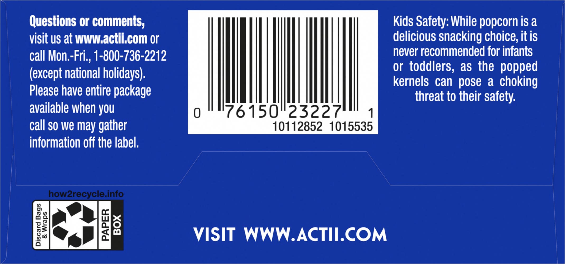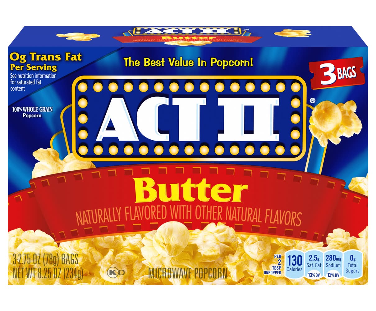 Experience a pop of buttery flavor in every fluffy kernel with a 3-count box of ACT II Butter Popcorn. This ACT II Butter flavored microwave popcorn is made with 100% whole grain popcorn kernels and contains 0 grams of trans fat per serving. Pop for two minutes in the microwave, and enjoy the perfect balance of buttery and salty taste in every bite. Try this delicious salty snack for an after-school treat or family game night. Choose ACT II Butter Popcorn for the best value in popcorn. • Flavor: Butter • Pack size: 3 • Conagra Brands, PO Box 3534,Dept. A2,Chicago,IL,60654 • Packaging: Reusable