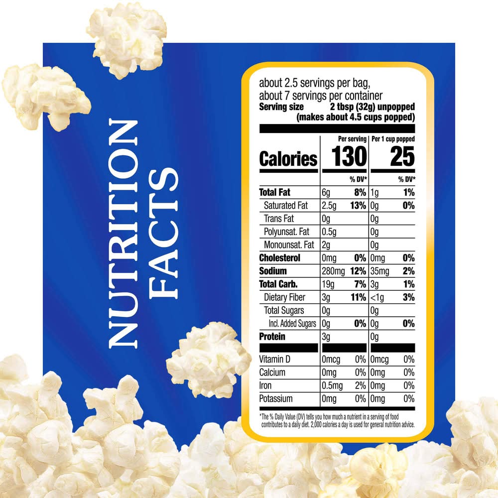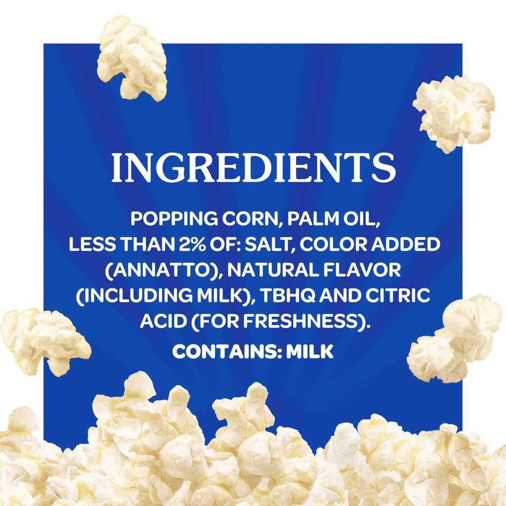 Ingredients: Popping Corn, Palm Oil, Less than 2% of: Salt, Color Added (Annatto), Natural Flavor (including Milk), TBHQ and Citric Acid (for freshness), . CONTAINS: MILK. Contains: Corn, Milk
