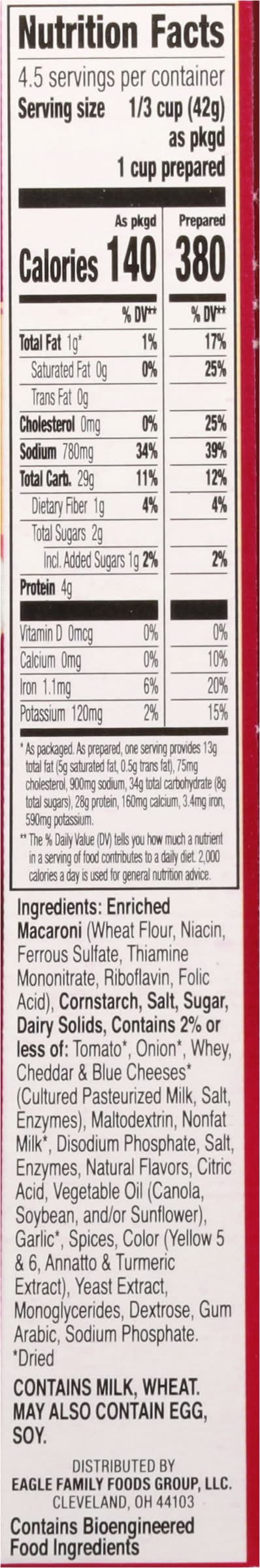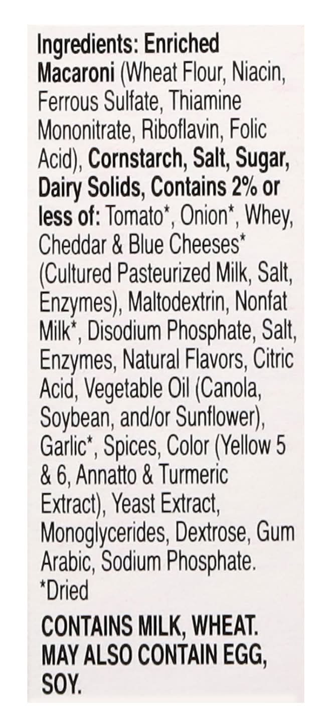 Ingredients: Enriched Macaroni (Wheat Flour, Niacin, Ferrous Sulfate, Thiamine Mononitrate, Riboflavin, Folic Acid), Cornstarch, Salt, Sugar, Dairy Solids, Contains 2% or Less of: Tomato (Dried), Onion (Dried), Whey, Cheddar & Blue Cheeses (Dried) (Cultured Pasteurized Milk, Salt, Enzymes), Maltodextrin, Nonfat Milk (Dried), Disodium Phosphate, Salt, Enzymes, Natural Flavors, Citric Acid, Vegetable Oil (Canola, Soybean, and/or Sunflower), Garlic (Dried), Spices, Color (Yellow 5 & 6, Annatto & Turmeric Extract), Yeast Extract, Monoglycerides, Dextrose, Gum Arabic, Sodium Phosphate Contains: Wheat, Corn, Milk, Eggs, Soybeans