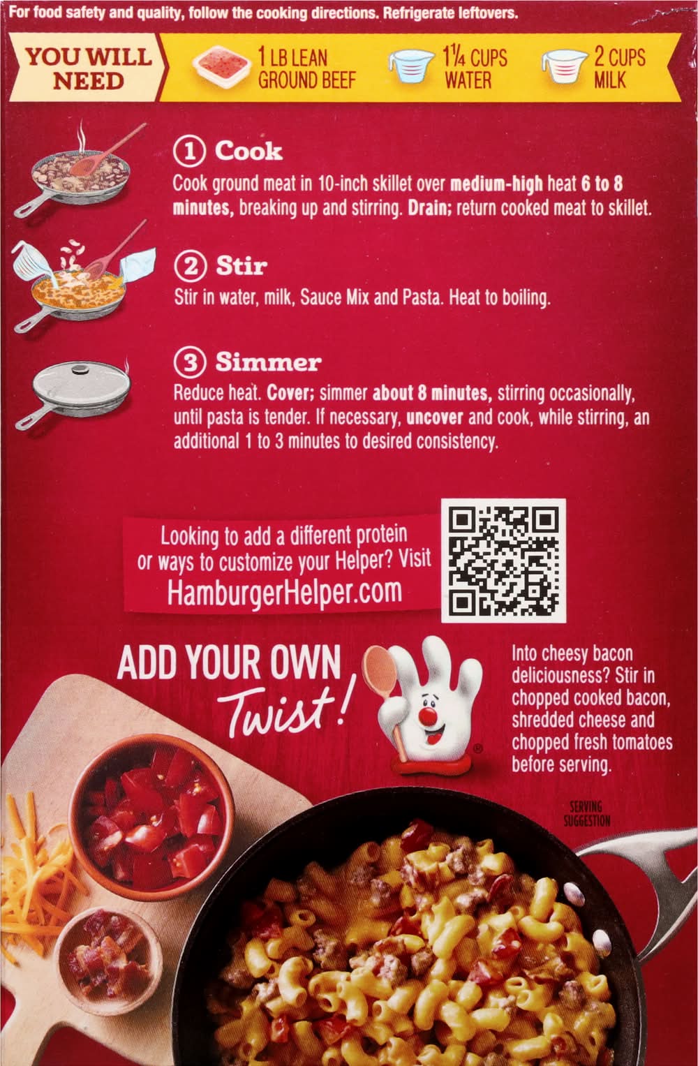 Pasta & cheese sauce mix with other natural flavors. Contains bioengineered food ingredients. Creamy & cheese sauce. Add ground beef. Looking to add a different protein or ways to customize your Helper.