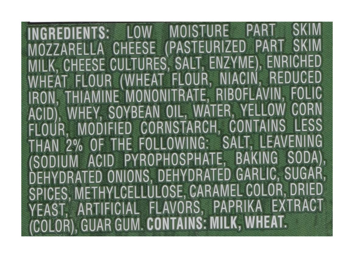 Ingredients: LOW MOISTURE PART SKIM MOZZARELLA CHEESE (PASTEURIZED PART SKIM MILK, CHEESE CULTURES, SALT, ENZYME), ENRICHED WHEAT FLOUR (WHEAT FLOUR, NIACIN, REDUCED IRON, THIAMINE MONONITRATE, RIBOFLAVIN, FOLIC ACID), WHEY, SOYBEAN OIL, WATER, YELLOW CORN FLOUR, MODIFIED CORNSTARCH, CONTAINS LESS THAN 2% OF THE FOLLOWING: SALT, LEAVENING (SODIUM ACID PYROPHOSPHATE, BAKING SODA), DEHYDRATED ONIONS, DEHYDRATED GARLIC, SUGAR, SPICES, METHYLCELLULOSE, CARAMEL COLOR, DRIED YEAST, ARTIFICIAL FLAVORS, PAPRIKA EXTRACT (COLOR), GUAR GUM. Contains: Milk, Wheat, Soybeans