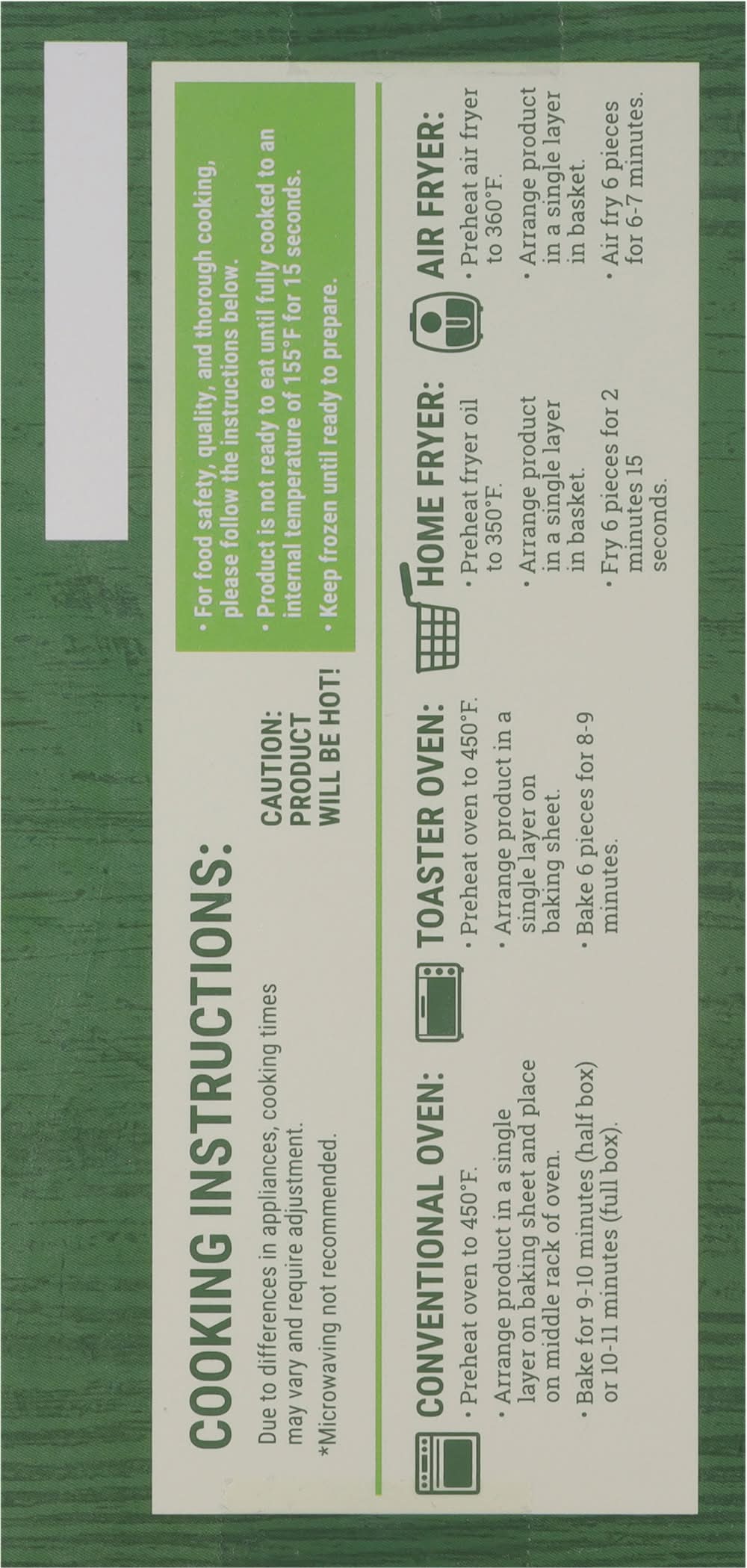 Directions for use: Directions: Conventional Oven: Preheat oven to 450 degrees F. Arrange product in a single layer on baking sheet and place on middle rack of oven. Bake for 9-10 minutes (half box) or 10-11 minutes (full box). Toaster Oven: Preheat oven to 450 degrees F. Arrange product in a single layer on baking sheet. Bake 6 pieces for 8-9 minutes. Home Fryer: Preheat fryer oil to 350 degrees F. Arrange product in a single layer in basket. Fry 6 pieces for 2 minutes 15 seconds. Air Fryer: Preheat air fryer to 360 degrees F. Arrange product in a single layer in basket. Air fry 6 pieces for 6-7 minutes. Cooking Instructions: Due to difference in appliances, cooking times may vary and require adjustment. For food safety, quality, and thorough cooking, please follow the instructions below. Product is not ready to eat until fully cooked to an internal temperature of 155 degrees F for 15 seconds. Keep frozen until ready to prepare. Caution: Product will be hot! Keep frozen, ready to cook. Storage recommendation: Keep frozen, ready to cook.
