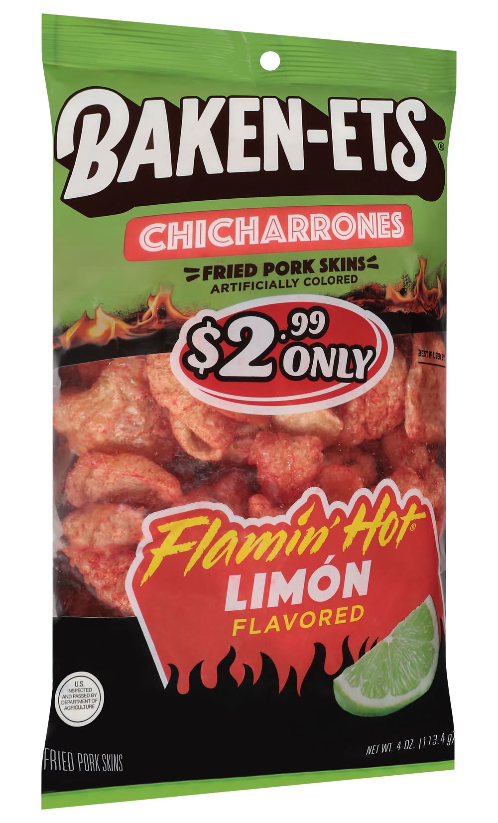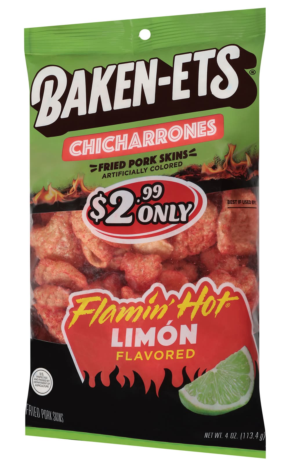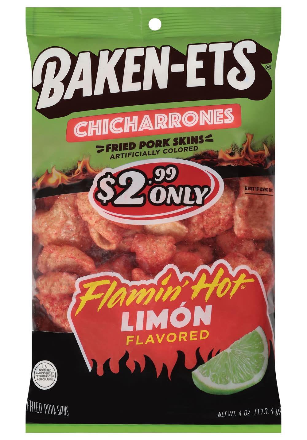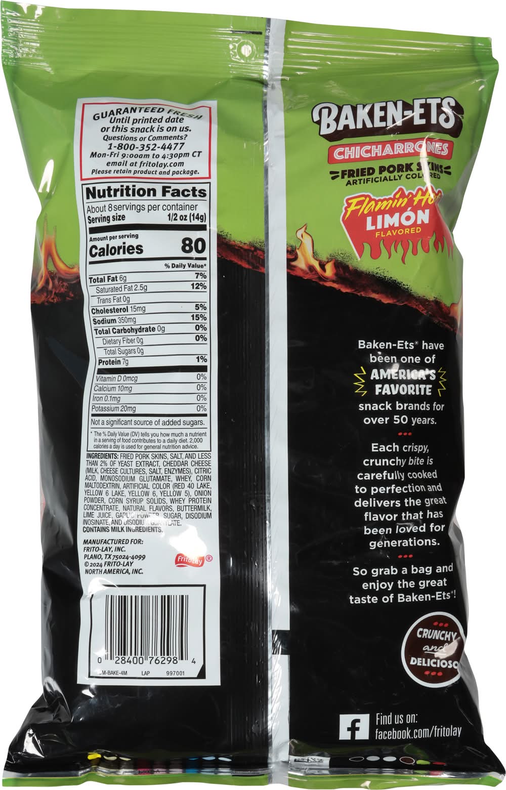 BAKEN-ETS pork skins have been Americas favorite pork skin snack for over 50 years. We cook each crispy, crunchy bite to perfection to bring you the great flavor thats been loved for generations. • Flavor: Flamin' hot limon • Frito-Lay, Inc., PLANO, TX 75024-4099