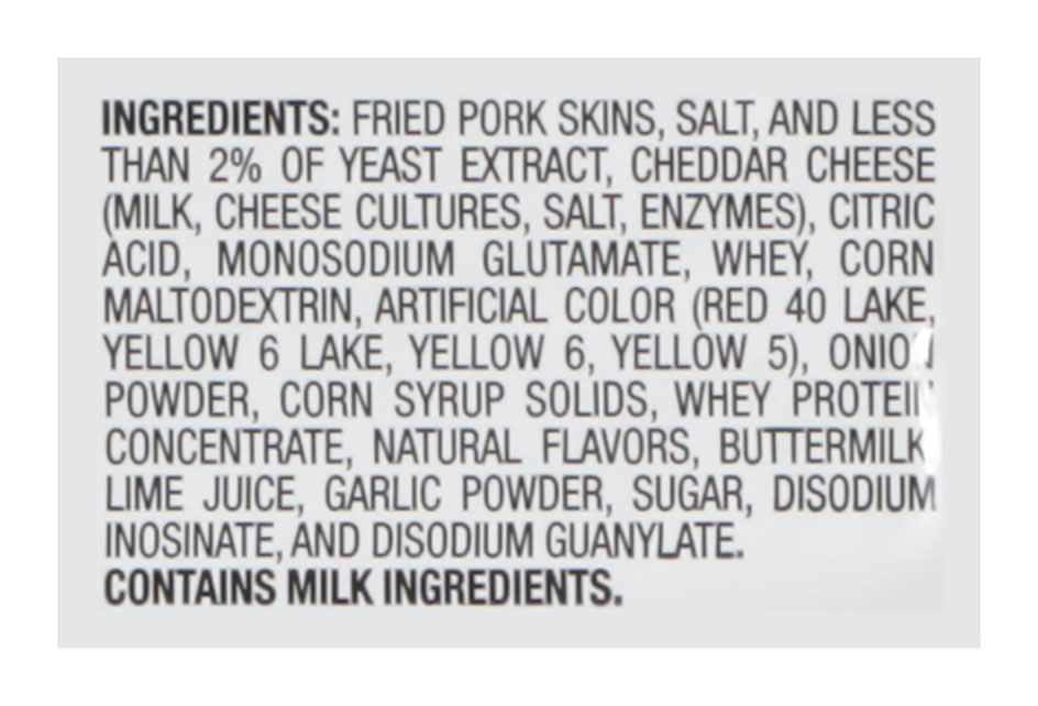 Ingredients: Fried Pork Skins, Salt, and Less than 2% of Yeast Extract, Cheddar Cheese (Milk, Cheese Cultures, Salt, Enzymes), Citric Acid, Monosodium Glutamate, Whey, Corn Maltodextrin, Artificial Color (Red 40 Lake, Yellow 6 Lake, Yellow 6, Yellow 5), Onion Powder, Corn Syrup Solids, Whey Protein Concentrate, Natural Flavors, Buttermilk, Lime Juice, Garlic Powder, Sugar, Disodium Inosinate, and Disodium Guanylate Contains: Corn, Milk