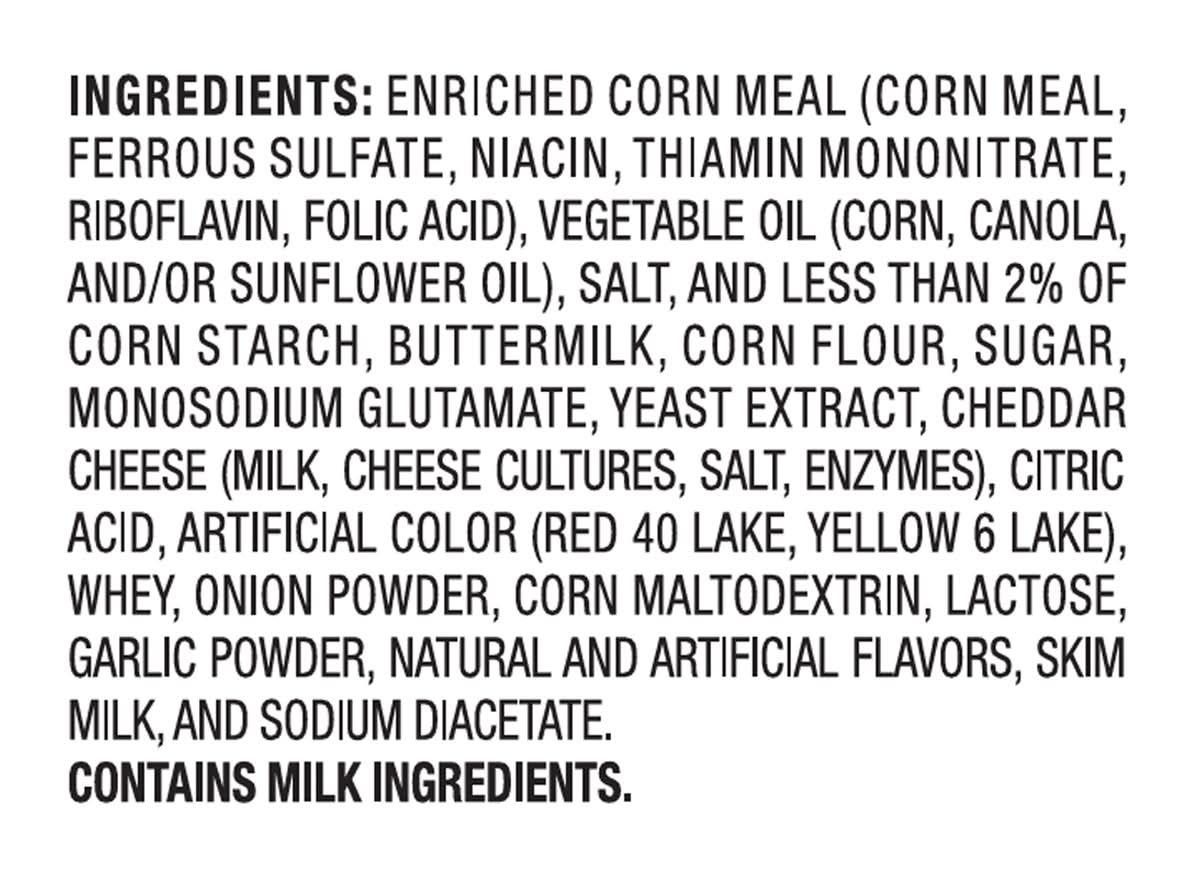 Ingredients: Enriched Corn Meal (Corn Meal, Ferrous Sulfate, Niacin, Thiamin Mononitrate, Riboflavin, Folic Acid), Vegetable Oil (Corn, Canola, and/or Sunflower Oil), Salt, and Less than 2% of Corn Starch, Buttermilk, Corn Flour, Sugar, Monosodium Glutamate, Yeast Extract, Cheddar Cheese (Milk, Cheese Cultures, Salt, Enzymes), Citric Acid, Artificial Color (Red 40 Lake, Yellow 6 Lake), Whey, Onion Powder, Corn Maltodextrin, Lactose, Garlic Powder, Natural and Artificial Flavors, Skim Milk, and Sodium Diacetate Contains: Milk, Corn, Lactose