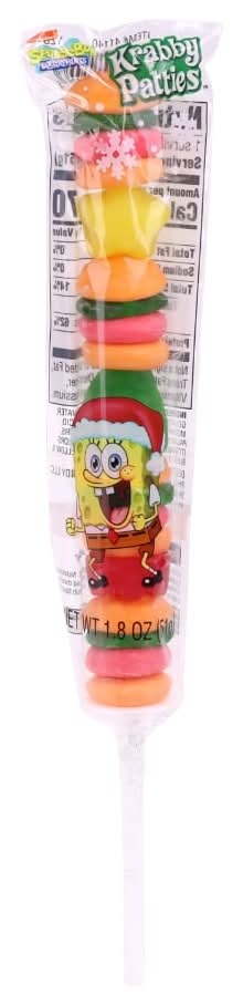 Fill those stockings with what they really want this season, tasty sweets from pop culture favorite, SpongeBob Squarepants! Each gummy kabob lollipop stick is stacked with classic original flavor Krabby Patties burgers plus fun holiday shapes including a star and Christmas tree. Net weight: 1.8 oz. Brought to you by the creators of the gummy Krabby Patty burger, Frankford Candy.