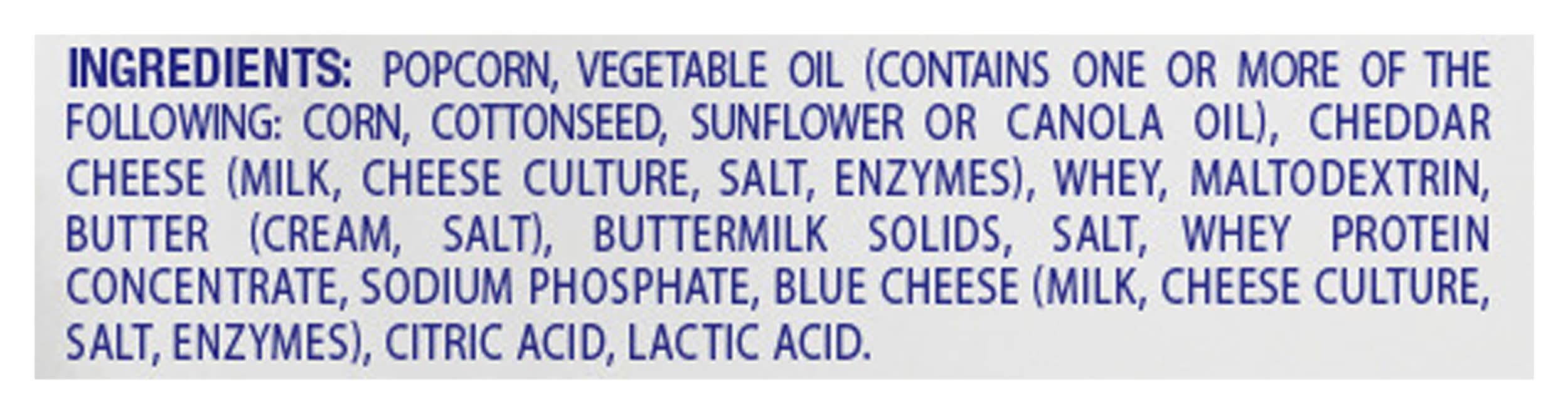Ingredients: Popcorn, Vegetable Oil (Contains One or More of the Following: Corn, Cottonseed, Sunflower or Canola Oil), Cheddar Cheese (Milk, Cheese Culture, Salt, Enzymes), Whey, Maltodextrin, Butter (Cream, Salt), Buttermilk Solids, Salt, Whey Protein Concentrate, Sodium Phosphate, Blue Cheese (Milk, Cheese Culture, Salt, Enzymes), Citric Acid, Lactic Acid Contains: Corn, Milk