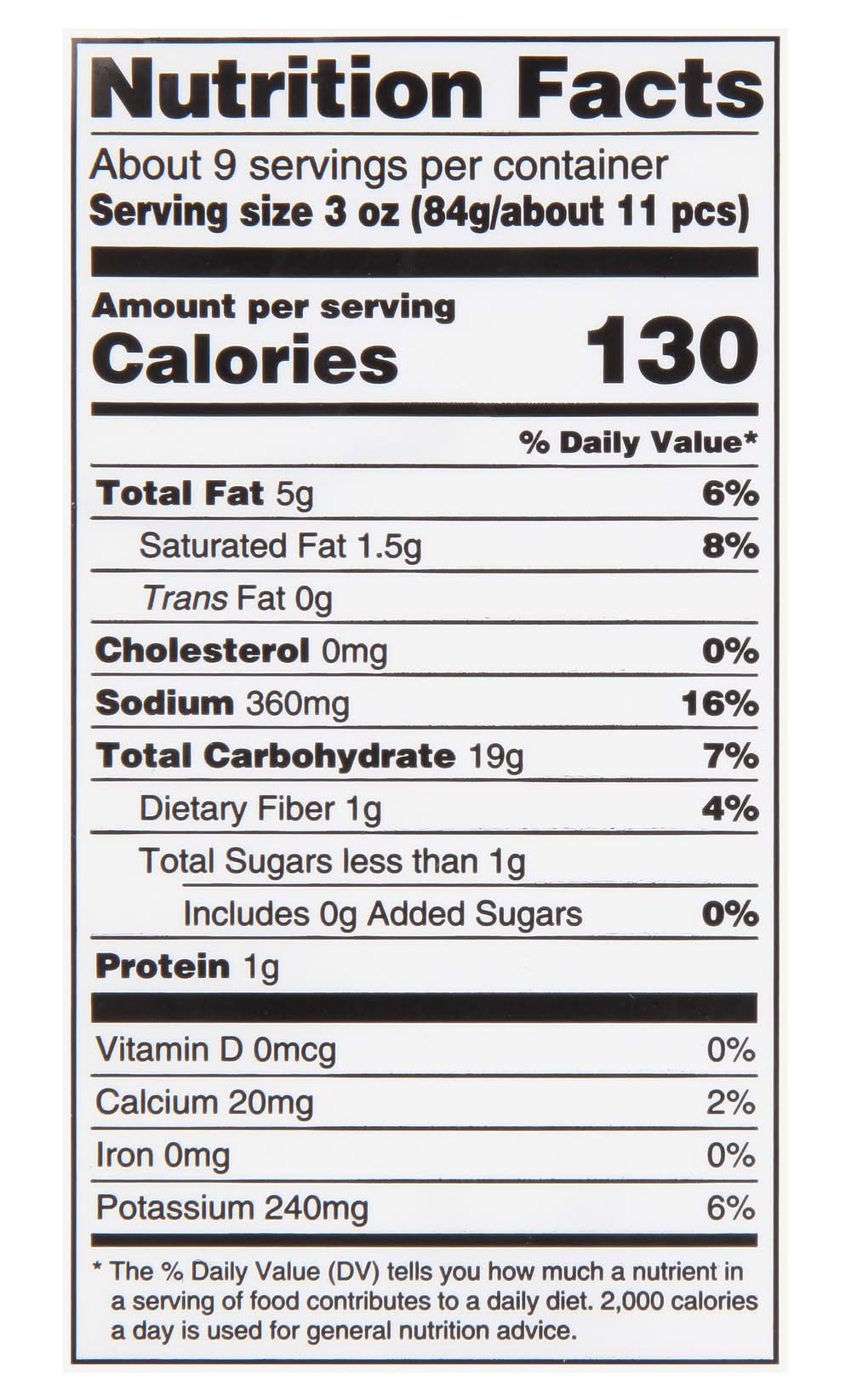 Ingredients: Potatoes, Vegetable Oil (Contains One or More of the Following: Canola, Palm, Soybean, Sunflower), Modified Food Starch (Corn, Potato, Tapioca), Rice Flour, Salt, Dextrin, Leavening (Glucono Delta-Lactone, Sodium Bicarbonate), Dextrose, Disodium Dihydrogen Pyrophosphate (to Promote Color Retention), Xanthan Gum, Color (Annatto, Turmeric) Contains: Corn, Soybeans