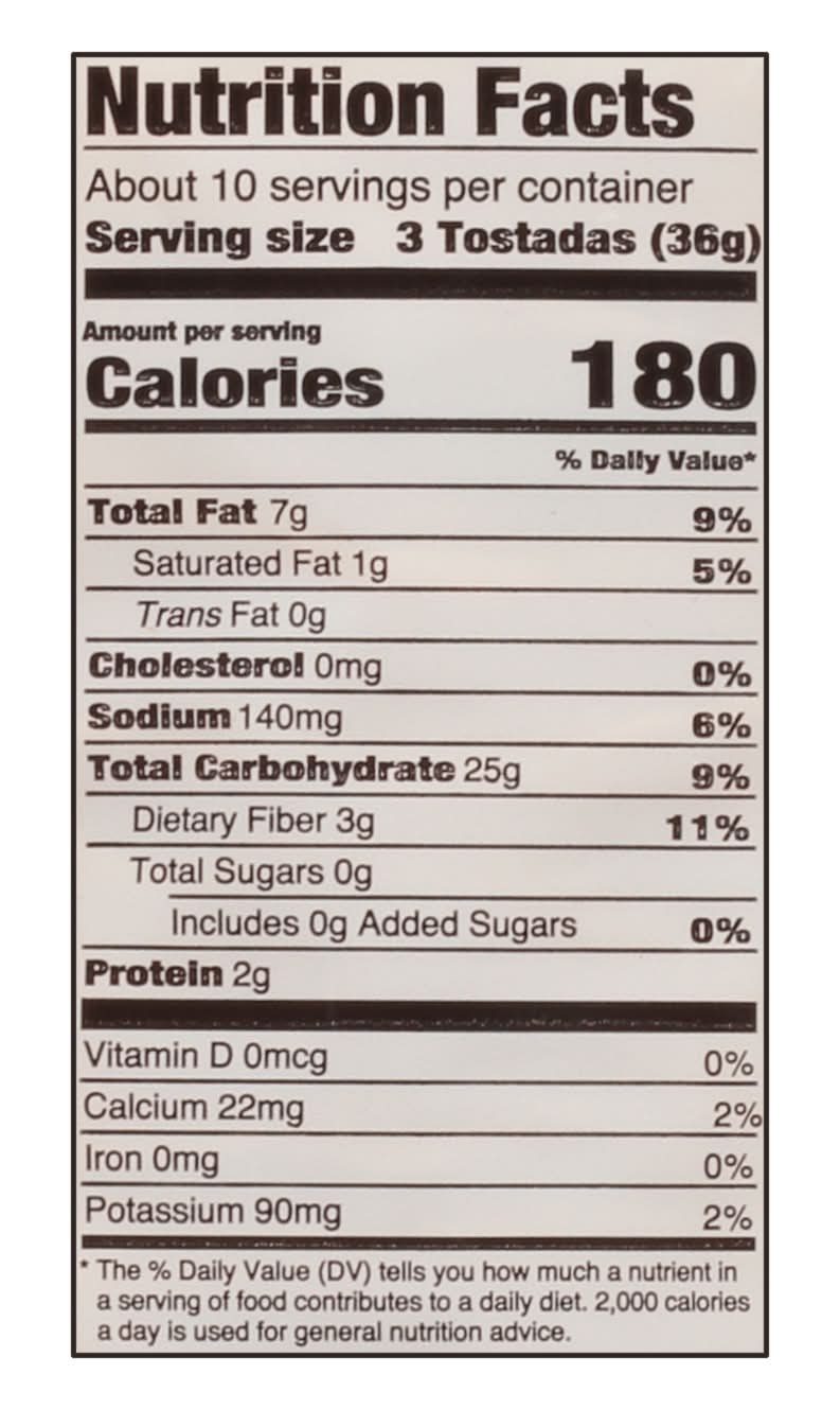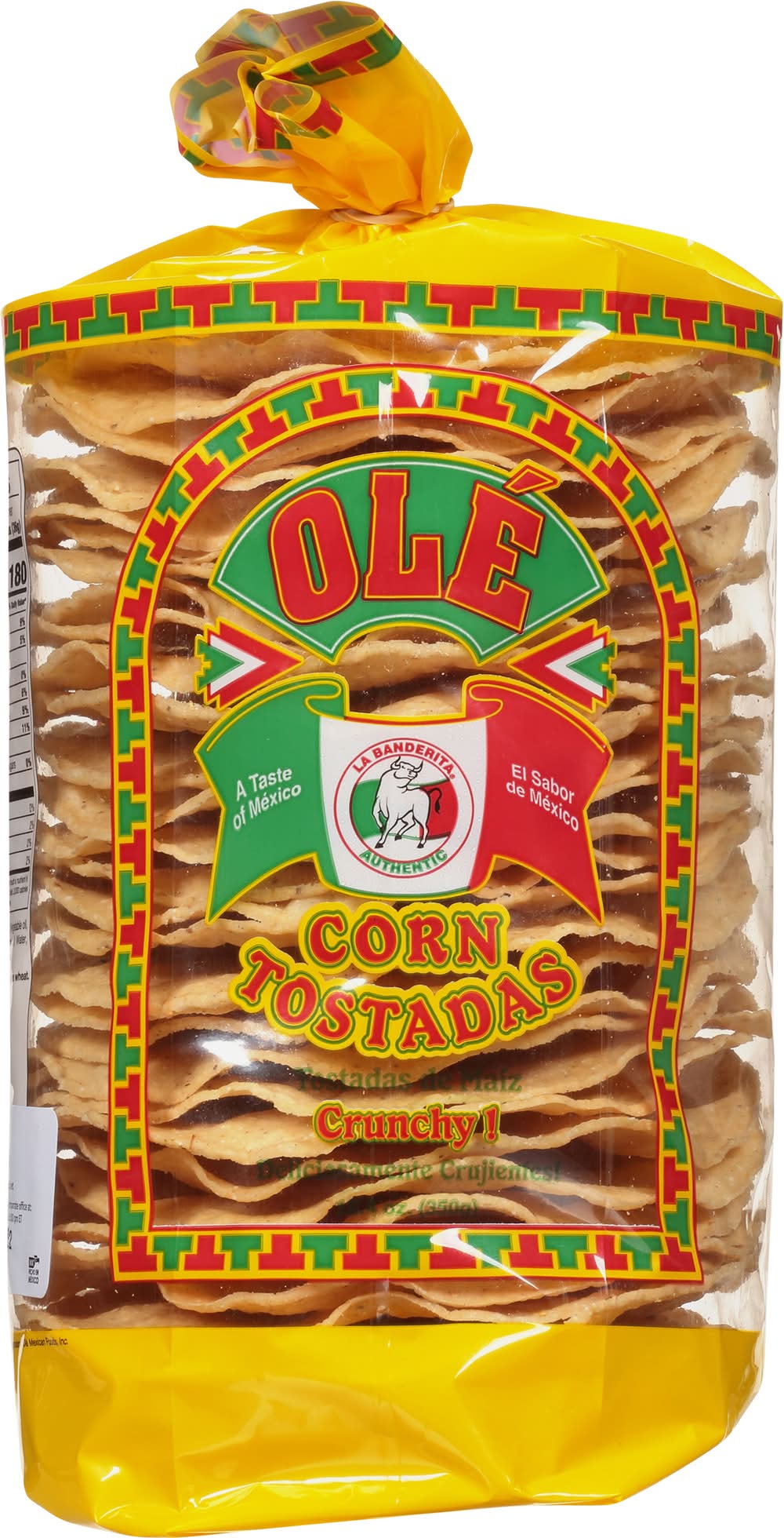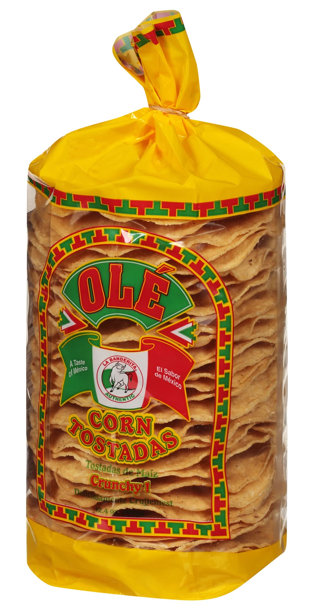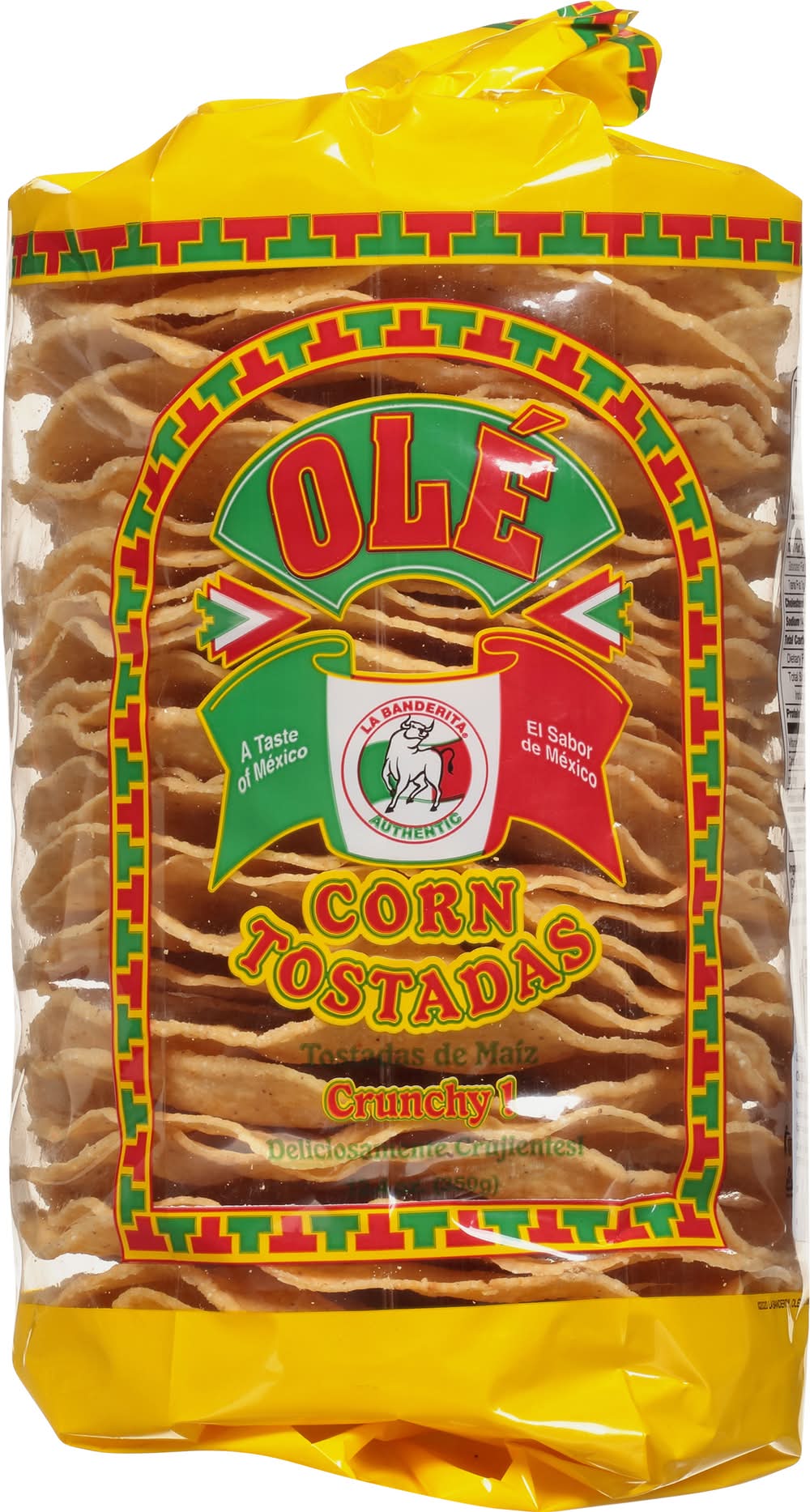 Ol Mexican Foods Corn Tostadas will quickly become a staple in your pantry! Our crunchy tostadas are not only gluten free, but they are also cholesterol free, they dont have any added sugar and only have 120 calories per serving. You can use them as a snack with some spread on top or use them with any protein or vegetable and your favorite toppings! Ready to eat, eat as is or warm up in the oven or toaster for one to two minutes. • Flavor: Corn • Ole Mexican Foods, Inc., Norcross,GA,30071,consumercare(at)olemexicanfoods.net