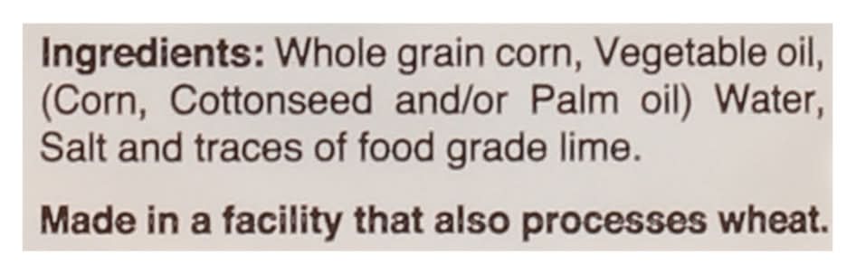 Ingredients: Whole Grain Corn, Vegetable Oil, (Corn Cottonseed and/or Palm Oil) Water, Salt and Traces of Food Grade Lime Contains: Wheat