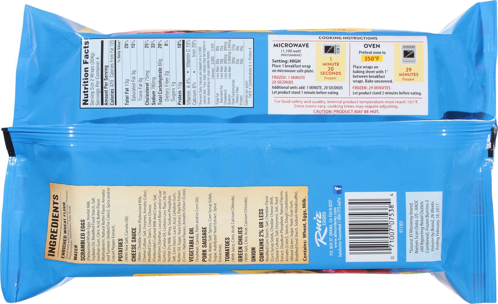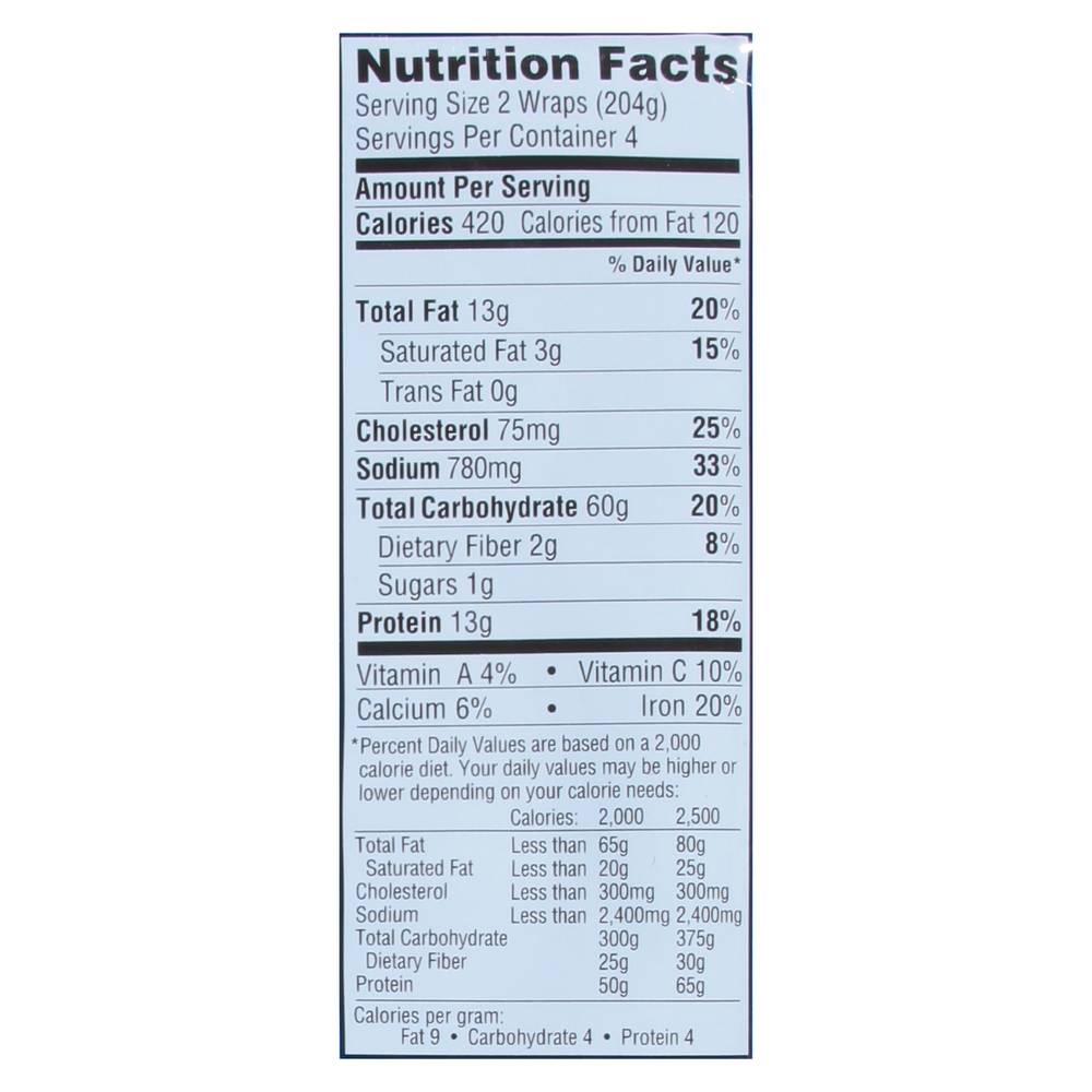 Directions for use: Cooking Instructions: Microwave (1,000 watt microwave). Setting: High place 1 breakfast wrap on microwave safe plate. Frozen: 1 minute 20 seconds. Additional units add: 1 minute, 20 seconds let product stand 1 minute before eating. Oven: Preheat oven to 350 degrees F. Place wraps on baking sheet with 1 inch between breakfast wraps. Bake uncovered. Frozen: 29 minutes. Let product stand 2 minutes before eating. For food safety and quality, internal product temperature must reach 161 degrees F. Since ovens vary, cooking times may require adjusting. Caution: Product may be hot. Keep frozen. Storage recommendation: Keep frozen.