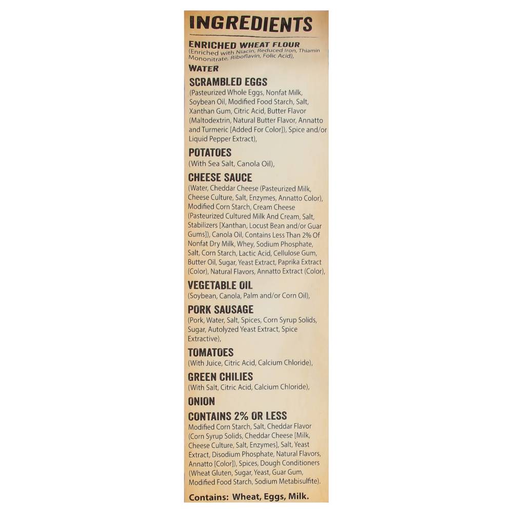 Ingredients: Enriched Wheat Flour (Enriched with Niacin, Reduced Iron, Thiamin Mononitrate, Riboflavin, Folic Acid), Water, Scrambled Eggs (Pasteurized Whole Eggs, Nonfat Milk, Soybean Oil, Modified Food Starch, Salt, Xanthan Gum, Citric Acid, Butter Flavor (Maltodextrin, Natural Butter Flavor, Annatto and Turmeric [Added for Color]), Spice and/or Liquid Pepper Extract), Potatoes (with Sea Salt, Canola Oil), Cheese Sauce (Water, Cheddar Cheese (Pasteurized Milk, Cheese Culture, Salt, Enzymes, Annatto Color), Modified Corn Starch, Cream Cheese (Pasteurized Culture Milk and Cream, Salt, Stabilizers [Xanthan, Locust Bean and/or Guar Gums]), Canola Oil, Contains Less than 2% of Nonfat Dry Milk, Whey, Sodium Phosphate, Salt, Corn Starch, Lactic Acid, Cellulose Gum, Butter Oil, Sugar, Yeast Extract, Paprika Extract (Color), Natural Flavors, Annatto Extract (Color), Vegetable Oil (Soybean, Canola, Palm and/or Corn Oil), Pork Sausage (Pork, Water, Salt, Spices, Corn Syrup Solids, Sugar, Autolyzed Yeast Extract, Spice Extractive), Tomatoes (with Juice, Citric Acid, Calcium Chloride), Green Chilies (with Salt, Citric Acid, Calcium Chloride), Onion, Contains 2% or Less Modified Corn Starch, Salt, Cheddar Flavor (Corn Syrup Solids, Cheddar Cheese [Milk, Cheese Culture, Salt, Enzymes], Salt, Yeast Extract, Disodium Phosphate, Natural Flavors, Annatto [Color]), Spices, Dough Conditioners (Wheat Gluten, Sugar, Yeast, Guar Gum, Modified Food Starch, Sodium Metabisulfite) Contains: Wheat, Eggs, Milk, Soybeans, Gluten, Sulfites